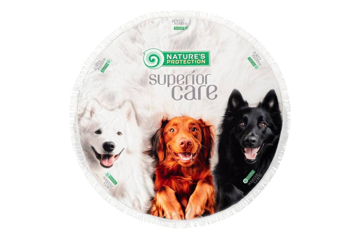 NATURE'S PROTECTION SUPERIOR CARE round microfiber towel, unique design, with puppies illustration and fringes 150x150 cm
