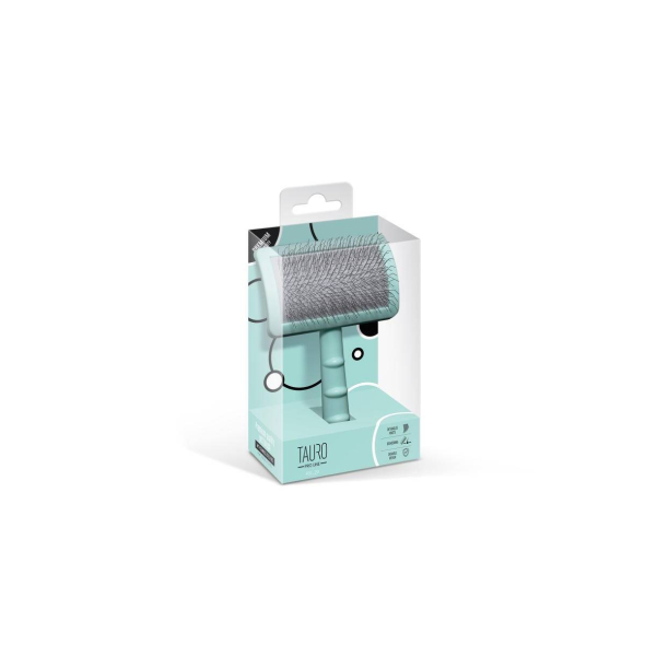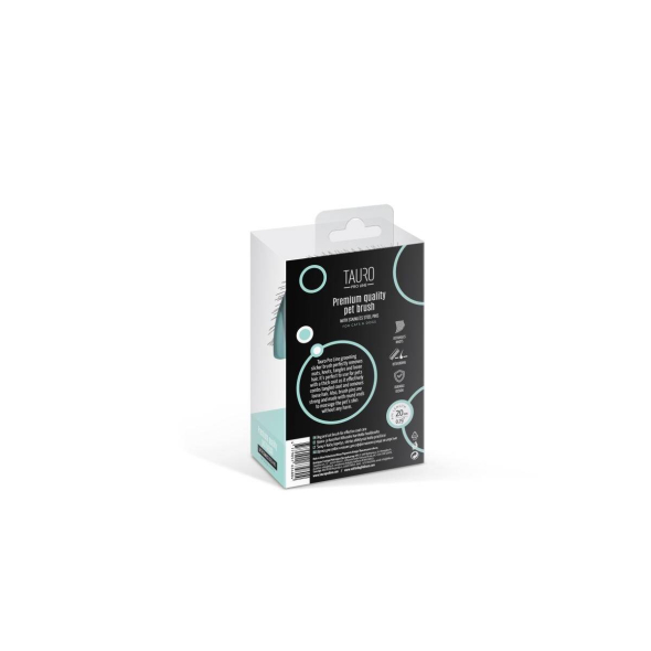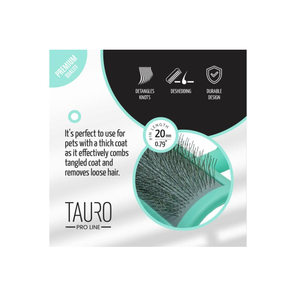 The Tauro Pro Line premium brush is expertly designed to make pet brushing easier. Its ergonomic design ensures it is lightweight, preventing hand fatigue during brushing sessions. The soft and elastic cushion adapts to your pet's skin, while the 20 mm long curved stainless steel teeth effectively comb through the coat, remove dead hair and tangles, and provide a gentle massage to improve circulation and promote hair growth. With this Tauro Pro Line brush, you can easily reach even hard-to-reach areas: armpits, muzzle, ears, and paws. Suitable for all coat types and compatible with small, medium, and large breeds. The special anti-static coating on the brush prevents hair from becoming electrified, resulting in smoother and shinier coats. Discover the Tauro Pro Line brushes, crafted by professionals using top-quality materials to ensure optimal results and an enjoyable brushing experience.