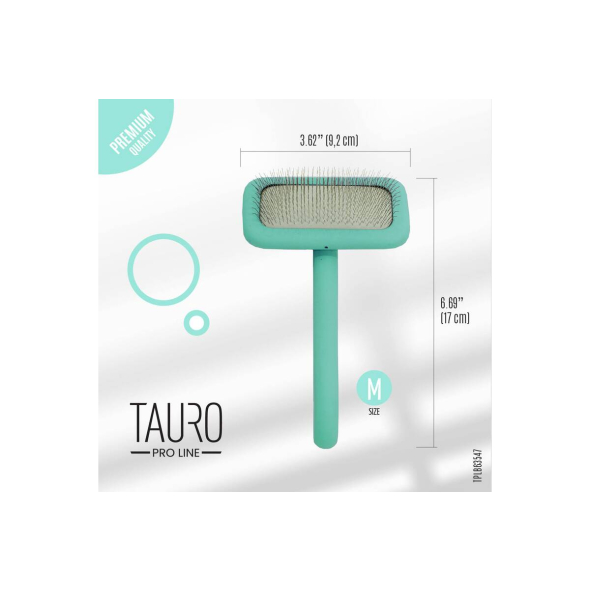 The Tauro Pro Line premium brush is expertly designed to make pet brushing easier. Its ergonomic design ensures it is lightweight, preventing hand fatigue during brushing sessions. The soft and elastic cushion adapts to your pet's skin, while the 11 mm long curved stainless steel teeth effectively comb through the coat, remove dead hair and tangles, and provide a gentle massage to improve circulation and promote hair growth. With this Tauro Pro Line brush, you can easily reach even hard-to-reach areas: armpits, muzzle, ears, and paws. Suitable for all coat types and compatible with small, medium, and large breeds. The special anti-static coating on the brush prevents hair from becoming electrified, resulting in smoother and shinier coats. Discover the Tauro Pro Line brushes, crafted by professionals using top-quality materials to ensure optimal results and an enjoyable brushing experience.