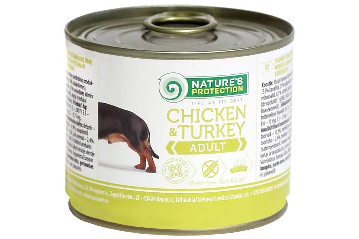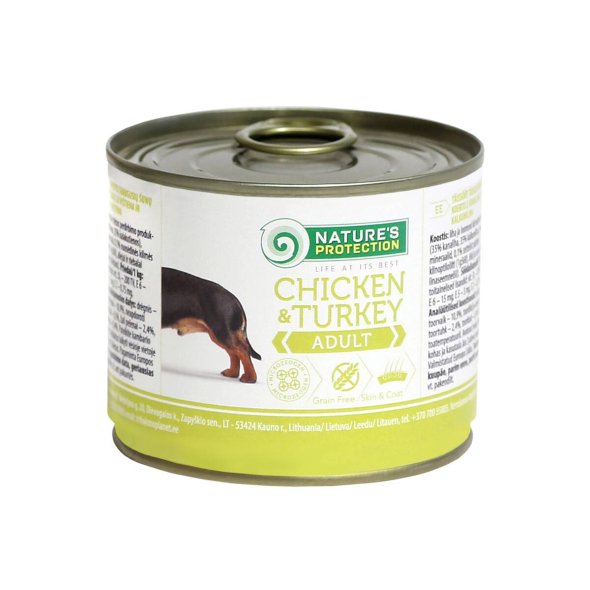 Nature's Protection Canned Pet Food for Adult Dogs with Chicken and Turkey is a Super Premium canned pet food thoughtfully crafted to meet the dietary needs of adult dogs, providing a complete and balanced meal in every can. The primary protein sources, chicken and turkey, are of high nutritional value, delivering essential nutrients to support overall health and vitality. This gently cooked formula preserves the natural taste and aroma of the ingredients, ensuring an irresistible meal for your furry companion while maintaining the nutritional integrity of the recipe.