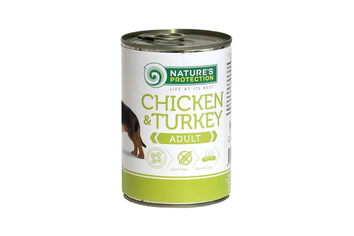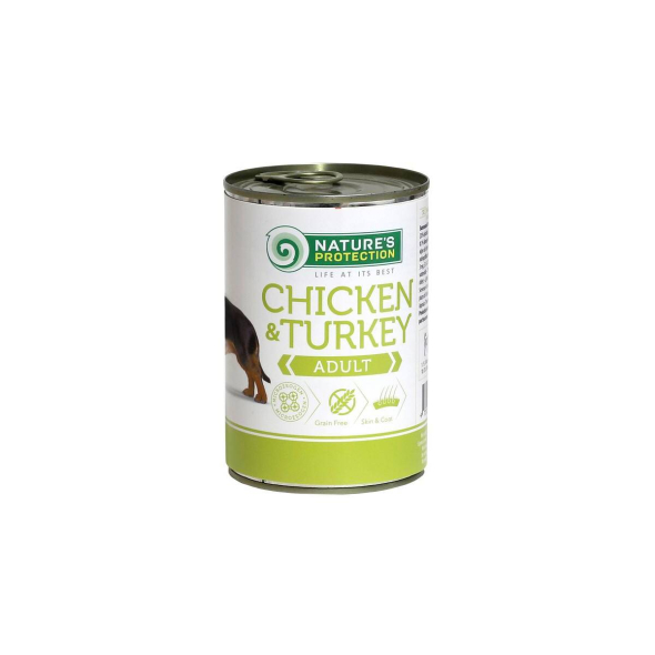 Nature's Protection Canned Pet Food for Adult Dogs with Chicken and Turkey is a Super Premium canned pet food thoughtfully crafted to meet the dietary needs of adult dogs, providing a complete and balanced meal in every can. The primary protein sources, chicken and turkey, are of high nutritional value, delivering essential nutrients to support overall health and vitality. This gently cooked formula preserves the natural taste and aroma of the ingredients, ensuring an irresistible meal for your furry companion while maintaining the nutritional integrity of the recipe.