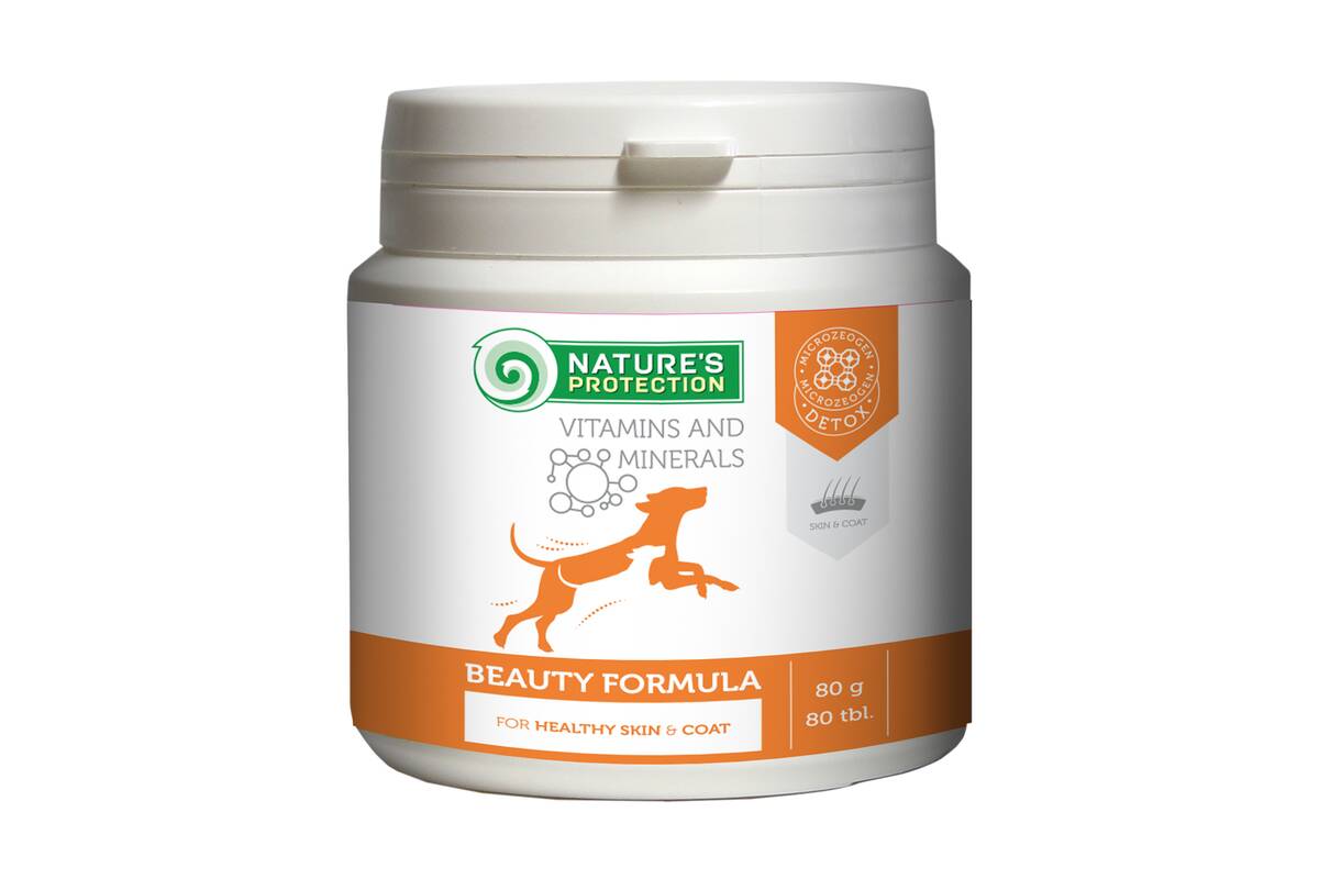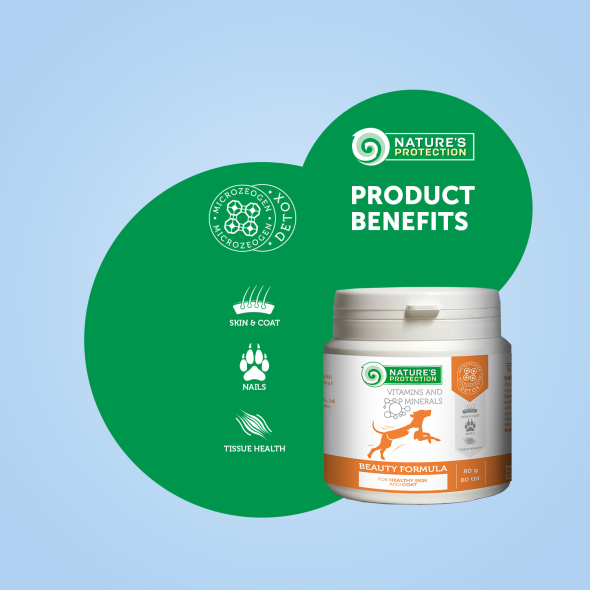 Nature's Protection Beauty Formula for Dogs is a specially formulated complementary feed that supports the health and appearance of your dog’s coat, skin, and nails. The unique combination of biotin, Microzeogen, and yeasts provides essential nutrients that promote the health of your pet's coat, skin, and nails. It is enriched with clinoptilolite of volcanic origin from nature – Microzeogen. It acts as an antioxidant and removes toxins, heavy metals, and viruses from the pet's body, when it is detoxified the body is cleaned and ready to absorb the antioxidants, vitamins and minerals into the body. Biotin is a B vitamin that is important for maintaining healthy skin, nails, and hair. It is also necessary for the metabolism of carbohydrates, fats, and proteins, which are essential building blocks for healthy tissue growth. The yeasts in the complementary feed provide essential amino acids and vitamins that promote healthy skin and coat. These ingredients work together to improve the condition of the skin and coat, while also promoting optimal pigmentation. Lack of these elements can cause eczema, itching, hair loss and hair breakage, pigmentation problems, dry skin, and nails can become soft and breakable.
