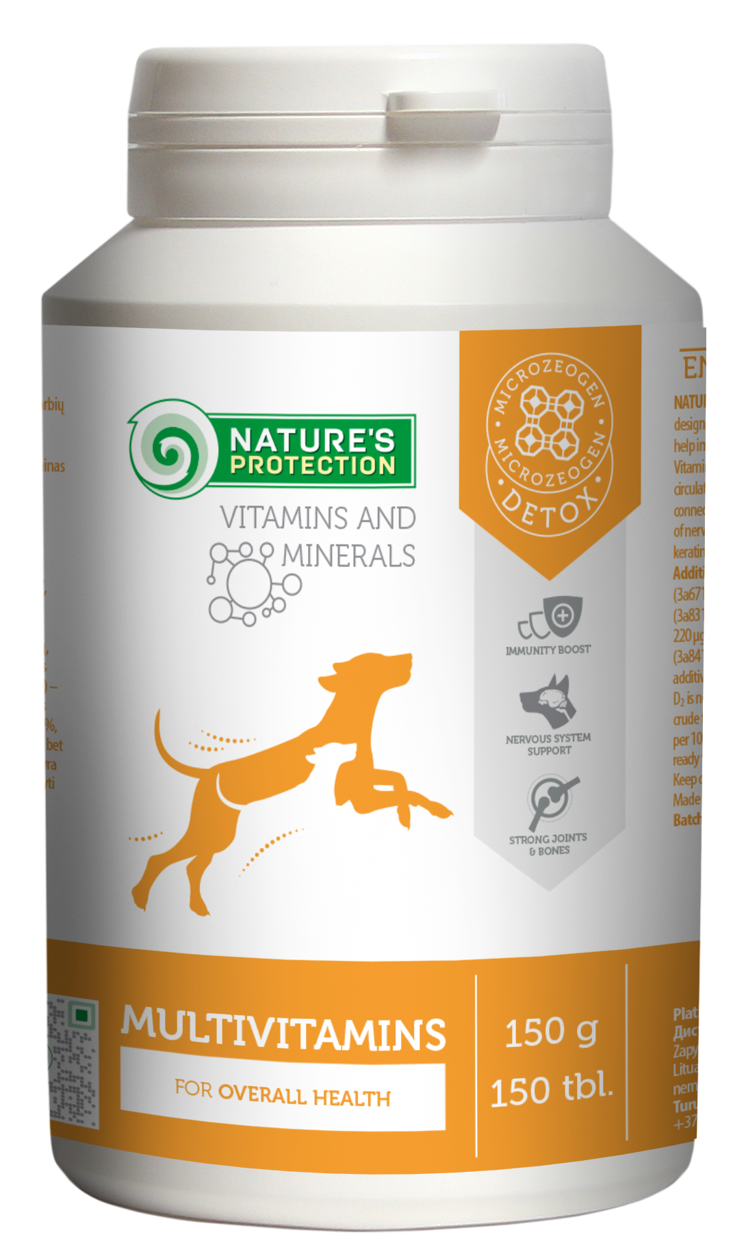 Nature's Protection Multivitamins complementary feed is designed to provide essential nutrients for dogs that may be lacking in their regular diet. The unique combination of biotin, Microzeogen, and yeasts provides essential nutrients that promote the health of your pet's coat, skin, and nails. This specially designed supplement is enriched with clinoptilolite of volcanic origin from nature – Microzeogen, which helps to remove toxins and improve nutrient absorption. This specially formulated supplement also contains vitamins A, D3, E, and C, as well as a complex of group B vitamins and biotin. Vitamin A is known to improve the health of the skin and mucous membranes, while also supporting the body's immune system. Vitamin D3 is important for regulating the absorption of calcium and phosphorus, which are vital for maintaining strong bones and teeth. Vitamin E helps balance the circulation of carbohydrates and hormones in the body, while vitamin C plays a key role in the formation of connective tissues and cartilage. The complex of group B vitamins in this supplement helps improve the transmission of nerve impulses and supports carbohydrate, fat, and protein metabolism. Biotin is included to help with keratin formation and coat strengthening, which can lead to healthier and shinier coat. Nature's Protection Multivitamins complementary feed for dogs it a convenient and effective way to support your pet's overall health.