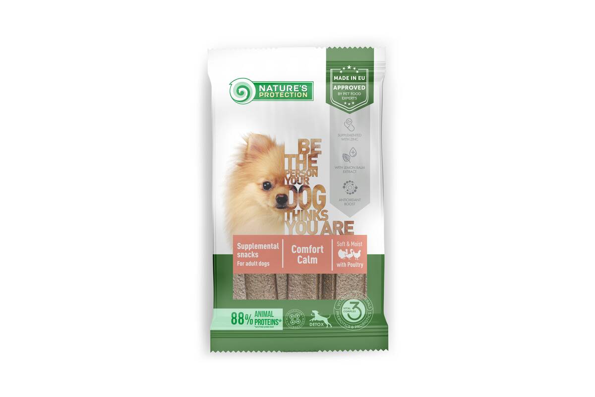 Nature's Protection Comfort Calm supplemental snacks are perfect for a pet's overall well-being and nervous system support. The main source of protein in supplemental snacks is poultry. It is a rich source of high-quality protein, that contains essential amino acids, vitamins, and minerals that are important for a healthy diet. Poultry meat is generally easy to digest and can be a good option for pets with sensitive stomachs or digestive issues. These functional snacks – supplements have a wetter and softer texture than the usual treats. Wetter products reveal a more natural aroma, making them a favourite for even the pickiest pets. Supplemental snacks are enriched with clinoptilolite of volcanic origin from nature - MicroZeoGen. It helps to remove toxins from the pet's body and when it is detoxified the efficient nutrients, vitamins, and minerals easily absorb into the body. The composition contains lemon balm which may help for reducing stress or anxiety while maintaining normal nervous system function.