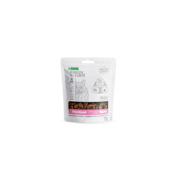 Nature's Protection Superior Care Sterilised supplemental snacks are perfect for a pet's overall well-being and sterilised cat's needs. The main protein source of these snacks is poultry. It can be an excellent source of high-quality and highly digestible (85-90%) protein for cats. It contains the essential amino acids needed to maintain and strengthen strong muscles, skin and coat. Poultry is also rich in vitamins and minerals such as vitamin B12, iron and zinc, which are important for overall health and well-being. The texture and shape of the treats are designed to help maintain good dental hygiene. Supplemental snacks are enriched with clinoptilolite of volcanic origin from nature - MicroZeoGen, which helps to remove toxins and improve nutrient absorption. The composition contains L-carnitine which is an amino acidthat can help with weight loss and maintain a healthy body condition in cats.