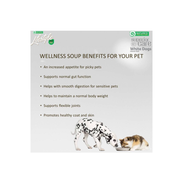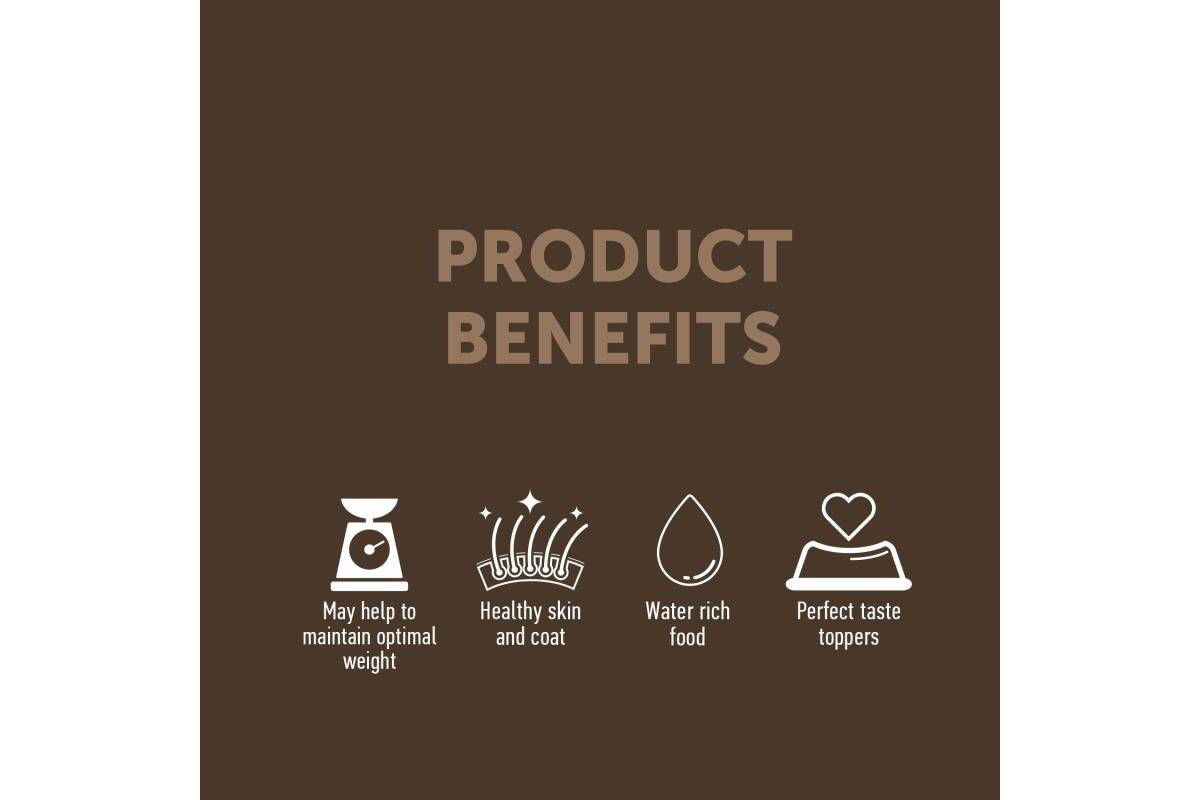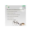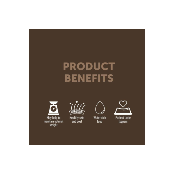 The recipe includes 20 % salmon fillet, a lean, high-quality protein source naturally rich in Omega-3 and Omega-6 fatty acids, known to promote coat and skin health. Brewer’s yeast (0.1 %) contributes to balanced digestion, while the gluten-free formula is gentle on the digestive system. With its low-calorie and high-moisture composition, this soup helps maintain both hydration and overall vitality.
