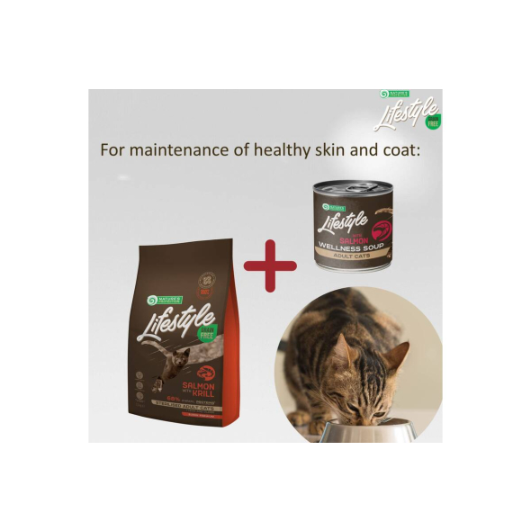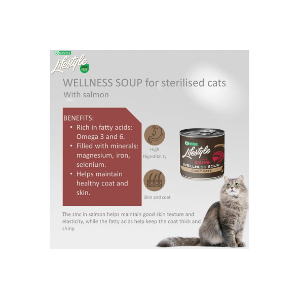 Nature’s Protection Lifestyle “Sterilised Salmon” is a functional soup created for sterilised adult cats, helping to support daily hydration, healthy skin, and an optimal body condition. Sterilised cats often drink less water and are more prone to weight gain or urinary issues, making this product a perfect addition to their daily diet.