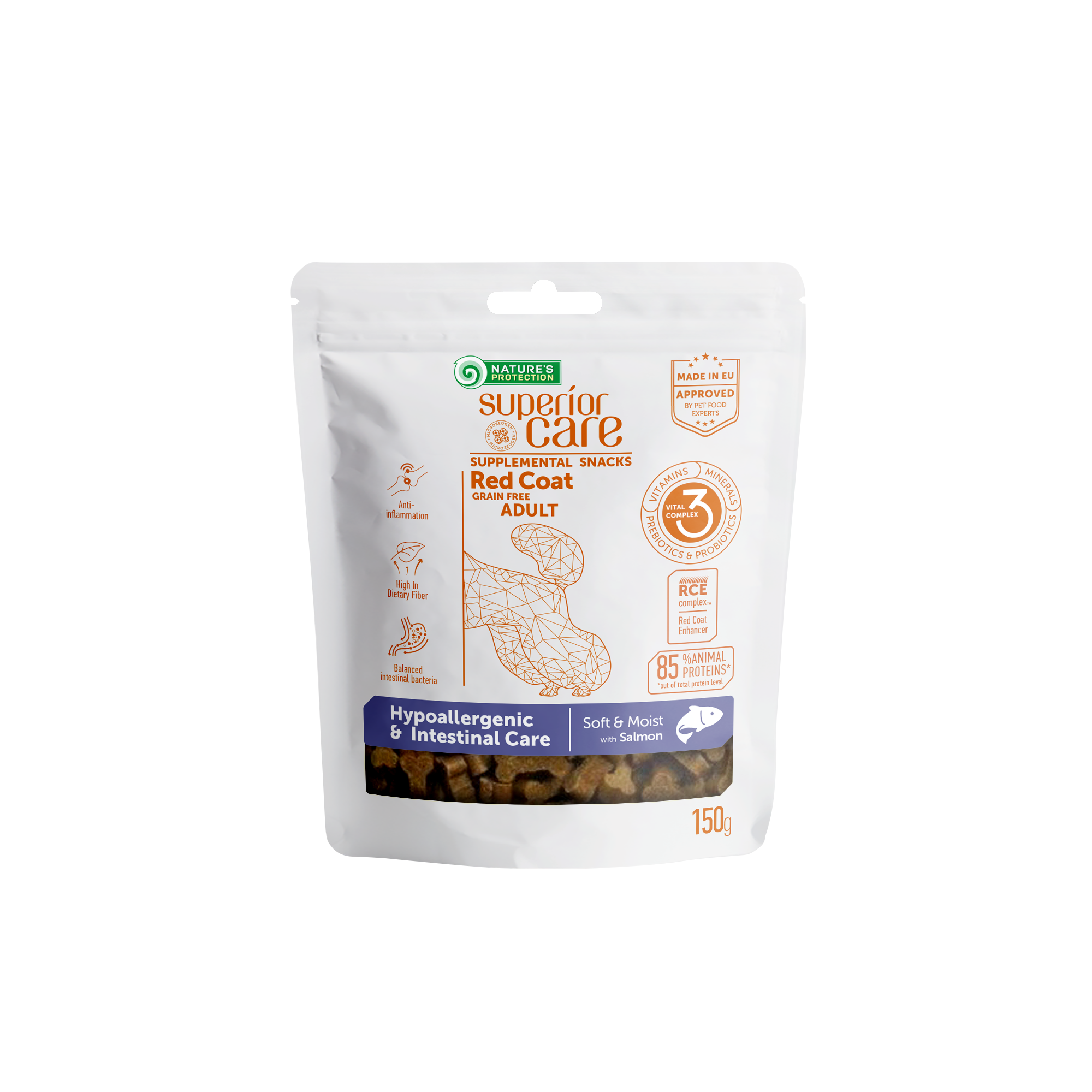 Nature's Protection Superior Care Red Coat Grain Free Hypoallergenic & Intestinal Care supplemental snacks perfect for pet's overall well-being and intestinal care support. The main source of protein in supplemental snacks is salmon. It is a good source of high-quality protein that is easily digestible, rich in omega-3 fatty acids, vitamins and minerals, and considered a hypoallergenic source of protein. Additionally, salmon is known as a highly palatable protein source. These functional snacks – supplements have a wetter and softer texture than the usual treats. Wetter products reveal a more natural aroma, making them a favourite for even the pickiest pets. Supplemental snacks are enriched with clinoptilolite of volcanic origin from nature - MicroZeoGen. It helps to remove toxins from the pet's body and when it is detoxified the efficient nutrients, vitamins, and minerals easily absorb into the body. The composition contains a balanced amount of prebiotics and probiotics in the treats that may help to ensure a proper balance of intestinal bacteria, a healthy intestinal environment and a smooth digestive process. The supplemental snacks do not contain ingredients of grain origin, corn or soy products that can cause allergic reactions.