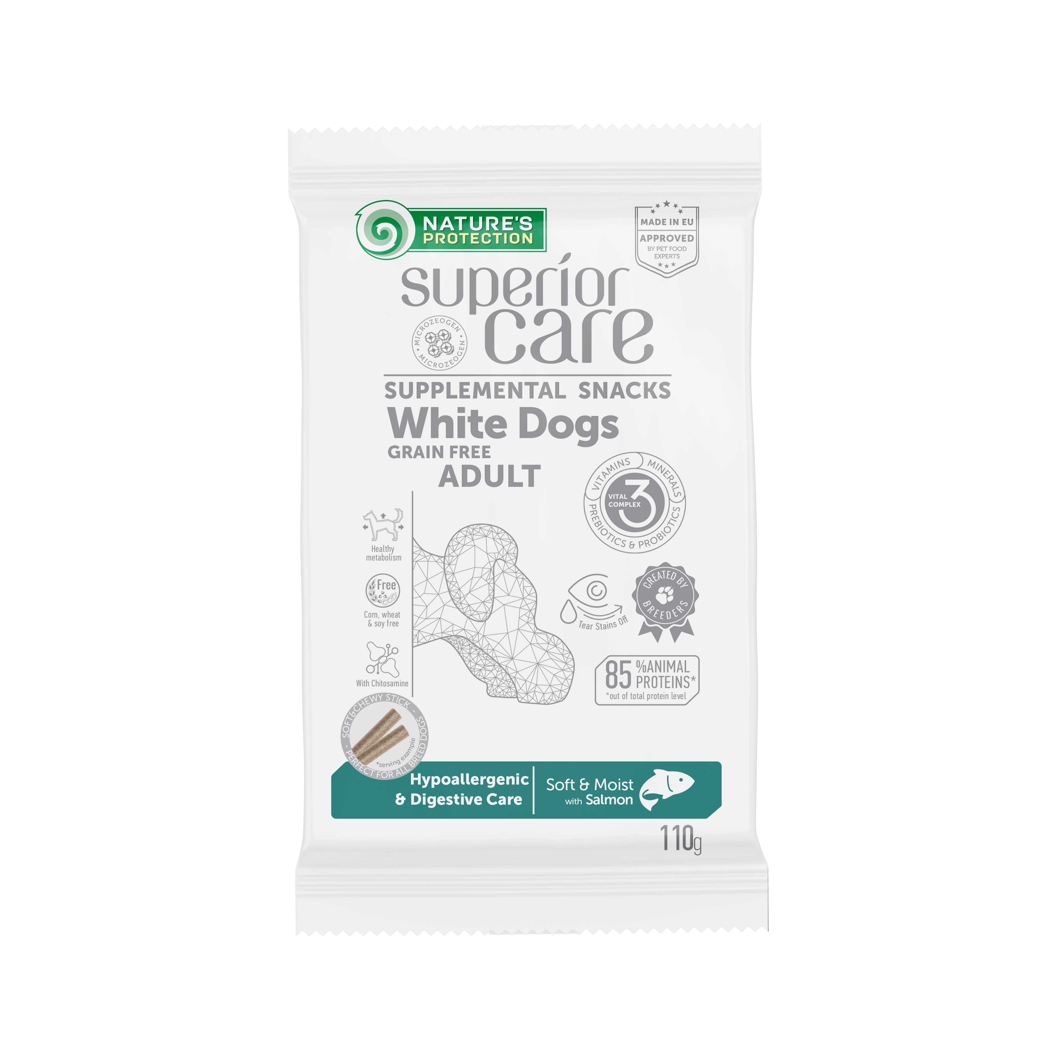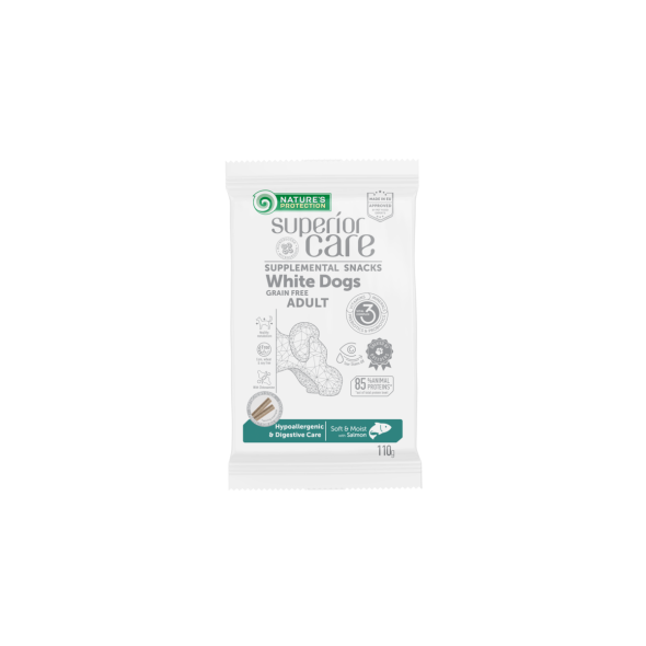 Nature's Protection Superior Care White Dogs Grain Free Hypoallergenic & Digestive Care supplemental snacksperfect for pet's overall well-being and digestive care support. The main source of protein in supplemental snacks is salmon. It is a good source of high-quality protein that is easily digestible, rich in omega-3 fatty acids, vitamins and minerals, and considered a hypoallergenic source of protein. Additionally, salmon is known as a highly palatable protein source. These functional snacks – supplements have a wetter and softer texture than the usual treats. Wetter products reveal a more natural aroma, making them a favourite for even the pickiest pets. Supplemental snacks are enriched with clinoptilolite of volcanic origin from nature - MicroZeoGen. It helps to remove toxins from the pet's body and when it is detoxified the efficient nutrients, vitamins, and minerals easily absorb into the body. The composition contains probiotics and prebiotics that may help to ensure the smooth breakdown of food and its conversion into energy. Natural pea fibreand inulin contribute to the good functioning of the digestive system. The supplemental snacks do not contain ingredients of grain origin, corn or soy products that can cause allergic reactions.