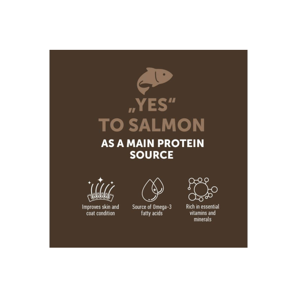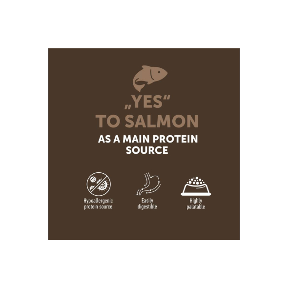 Composition: salmon min. 25 % (dried and finely ground), potato flakes, pregelatinised potato starch, sorbitol, glycerine, glucose syrup, brewer’s yeast (5,4 %), krill meal (4 %), pea fibre (4 %), salmon oil (2 %), dynamic micronized clinoptilolite (1 %), dried algae Schizochytrium sp. (0,16 %).