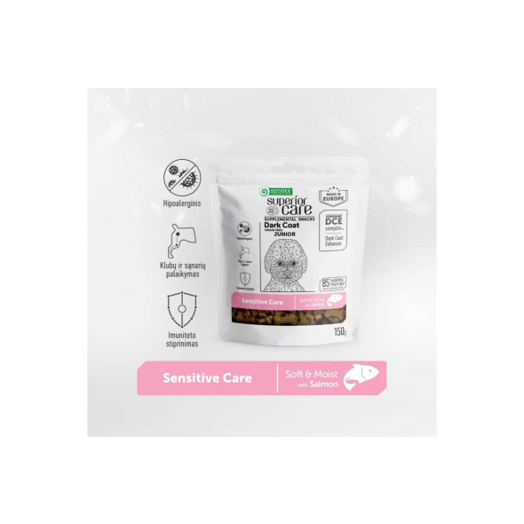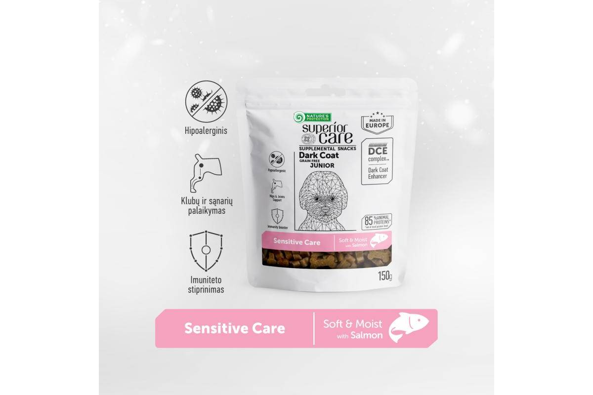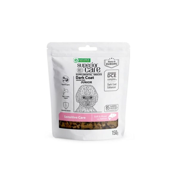 NATURE'S PROTECTION SUPERIOR CARE complementary grain free feed - snacks for sensitive care with salmon for junior all breed dogs with dark coat 150 g