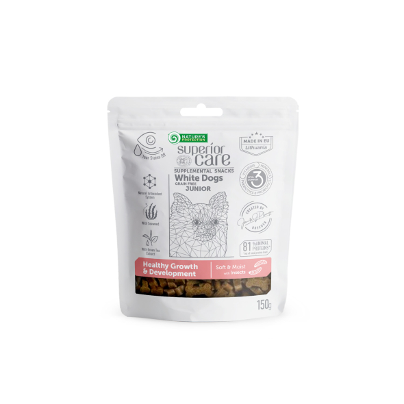 Nature's Protection Superior Care White Dogs Grain Free Healthy Growth & Development supplemental snacksperfect for pet's overall well-being and healthy growth support of young dogs. The main source of protein in supplemental snacks is insects. It is a highly sustainable source of protein, as they require less land, water, and feed than traditional livestock and a good source of high-quality protein, as well as essential amino acids, vitamins, and minerals. Processed insect protein is considered hypoallergenic, which makes it a good choice for dogs with food sensitivities or allergies. These functional snacks – supplements have a wetter and softer texture than the usual treats. Wetter products reveal a more natural aroma, making them a favourite for even the pickiest pets. Supplemental snacks are enriched with clinoptilolite of volcanic origin from nature - MicroZeoGen, which helps to remove toxins and improve nutrient absorption. The composition contains seaweed which is a source of vitamins - A, C, K and B6, calcium, potassium, copper, iodine and manganese that help to remove dental plaque. The supplemental snacks do not contain ingredients of grain origin, corn or soy products that can cause allergic reactions.