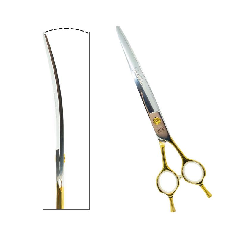 Tauro Pro Line curved scissors, Janita Plunge Line, made of the highest quality 440c grade stainless steel, are an excellent choice for those seeking a durable and high-quality tool for cutting a pet's coat. The scissors feature an ergonomic design and are durable. With conveniently curved blades, they facilitate achieving precise results effortlessly. Crafted from high-quality materials, these scissors are long-lasting, durable, and easy to handle.