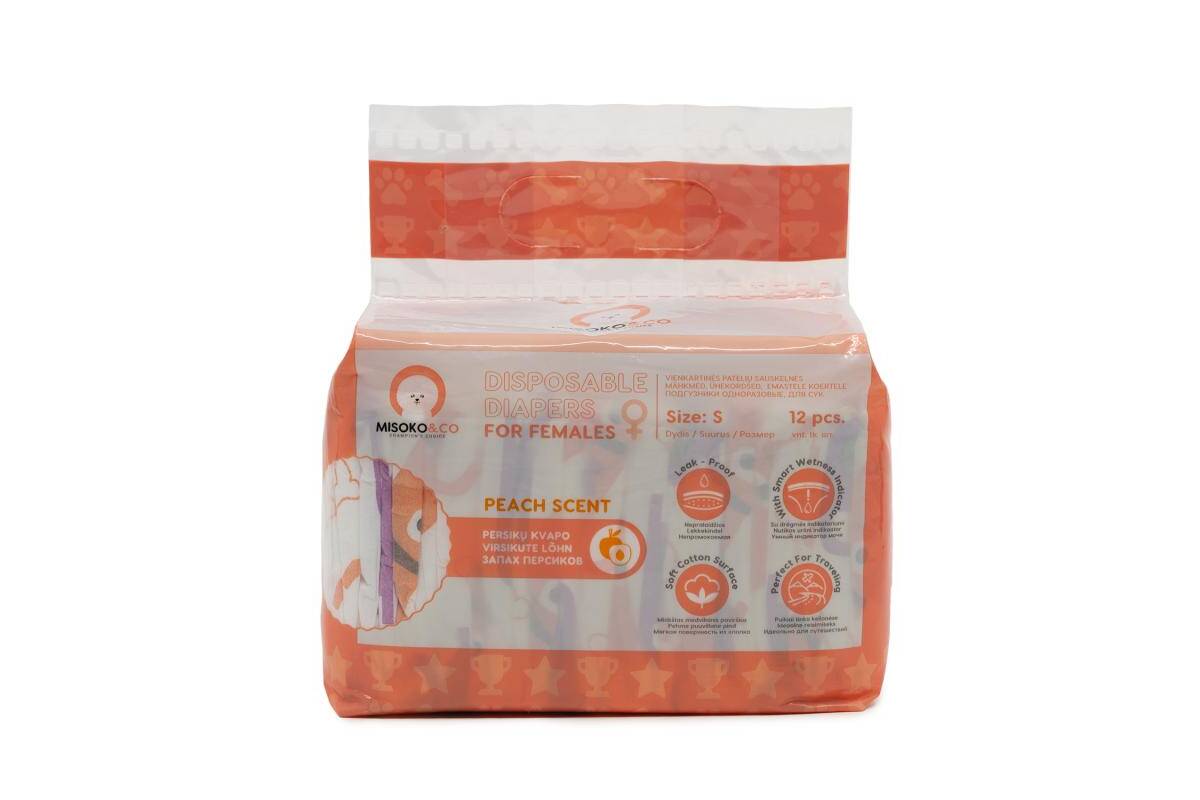MISOKO disposable diapers for female dogs with puppies and bones, moisture indicator, peach scent, size S, 12 pcs.