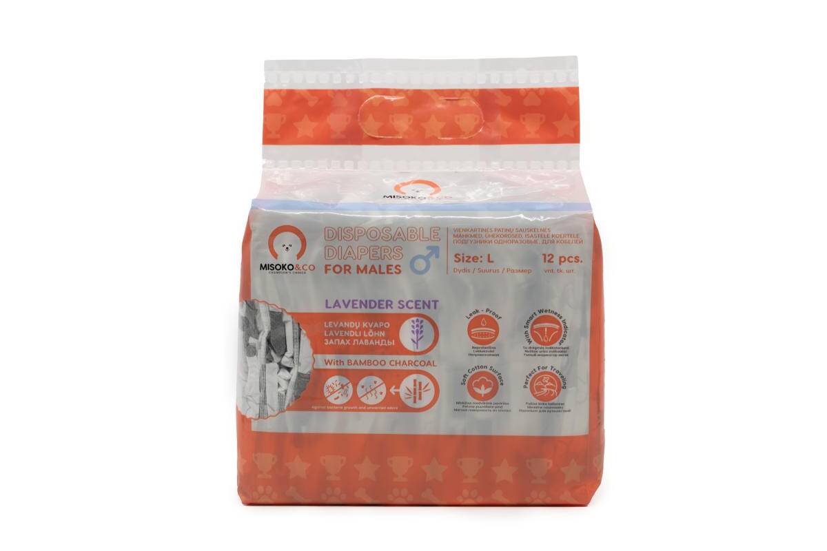 MISOKO disposable diapers for male dogs with puppies, charcoal, moisture indicator, lavender scent, size L, 12 pcs.