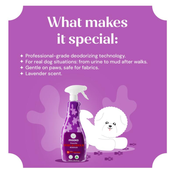MISOKO Lavender Spray with PRO-BACTERIA™ formula biologically neutralizes dog odors and stains. Safe for children and pets, perfect for daily use at home.