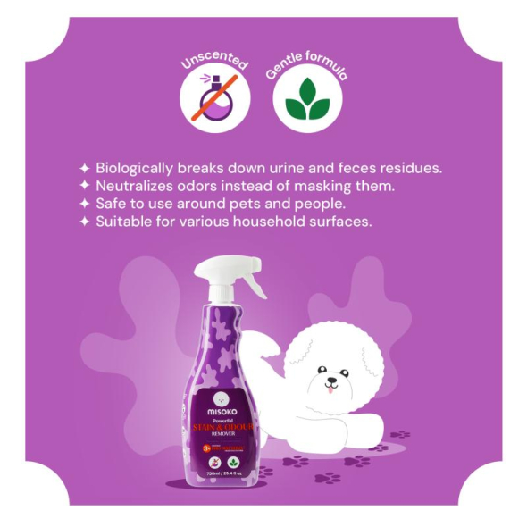 MISOKO Dog Stain & Odor Remover – Unscented, 750 ml, is designed for pet owners who value true cleanliness without added fragrances. The innovative PRO-BACTERIA™ bio-active formula biologically breaks down urine, feces, and other organic residues, neutralizing odors at the molecular level instead of masking them. This spray is ideal for people and pets sensitive to scents or allergic to strong fragrances.