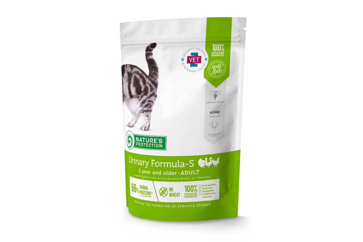 Nature's Protection Urinary Formula-S for adult cats are created with ingredients that are perfect for providing the necessary amount of calories, vitamins and minerals for cats with urinary tract systems prone to struvite bladder stones. The main protein source of this dry cat food is poultry. It is a high quality protein that is an excellent source of nutrition for cats, as it is packed with essential nutrients that can help promote good health. This dry food's complete and balanced composition is enriched with natural supplements like MicroZeoGen that help remove toxins from the body and support a healthy immune system. The composition is enriched with Omega-3 and Omega-6 fatty acids essential for healthy skin and coat conditions. As well as mono- and polyunsaturated fatty acids support the immune system, while saturated fatty acids provide required energy. This cat food is also fiber-rich diet that can help maintain healthy bowel movements, which can reduce the pressure on the bladder and urinary tract. All ingredients are carefully selected by veterinary and nutritional experts based on the true needs of your pet.