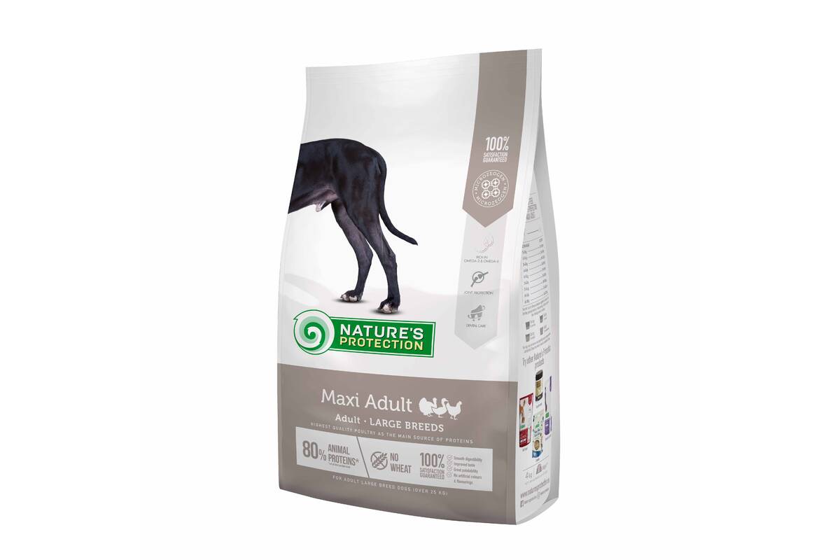 Nature's Protection Maxi for Adult Large Breed Dogs with Poultry is known for its well-balanced composition and raw materials, which help to support the joints and promote optimal mobility throughout adulthood. The main protein source of this dry dog food is poultry. It is a high quality protein that is an excellent source of nutrition for dogs, as it is packed with essential nutrients that can help promote overall health and provide energy. This dry dog food's complete and balanced composition is enriched with natural supplements like MicroZeoGen that help remove toxins from the body and support a healthy immune system. The composition contains Omega-3 and Omega-6 fatty acids essential for healthy skin and coat conditions. As well as mono- and polyunsaturated fatty acids support the immune system, while saturated fatty acids provide energy to a dog. Also, the feed contains natural antioxidants - vitamin E and rosemary extract can help protect cells against the negative impact of free radicals in a completely natural way. All ingredients are carefully selected by veterinary and nutritional experts based on the true needs of your pet.