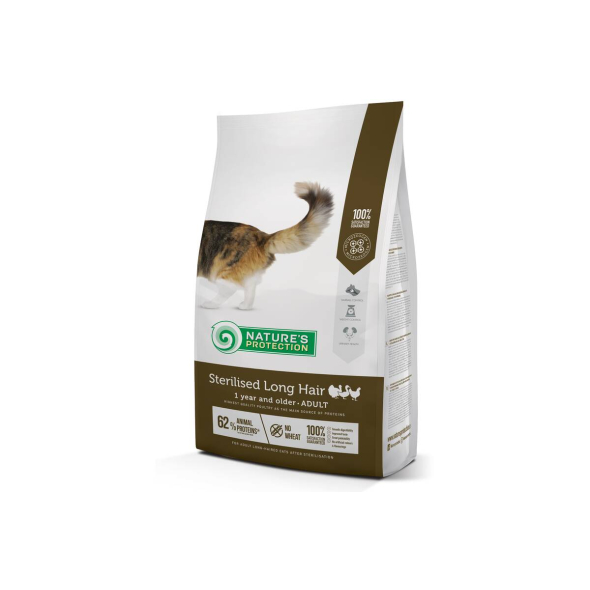 Nature's Protection Sterilised Long Hair for adult cats are created with ingredients that are perfect for providing the necessary amount of calories, vitamins and minerals for sterilised cats with long coat. The main protein source of this dry cat food is poultry. It is a high quality protein that is an excellent source of nutrition for cats, as it is packed with essential nutrients that can help promote good health. This dry food's complete and balanced composition is enriched with natural supplements like MicroZeoGen that help remove toxins from the body and support a healthy immune system. The composition is enriched with Omega-3 and Omega-6 fatty acids essential for healthy skin and coat conditions. As well as mono- and polyunsaturated fatty acids support the immune system, while saturated fatty acids provide required energy. This cat food is also fiber-rich diet designed to aid in hairball control, promoting healthy digestion and ensuring the overall well-being of cats. All ingredients are carefully selected by veterinary and nutritional experts based on the true needs of your pet.