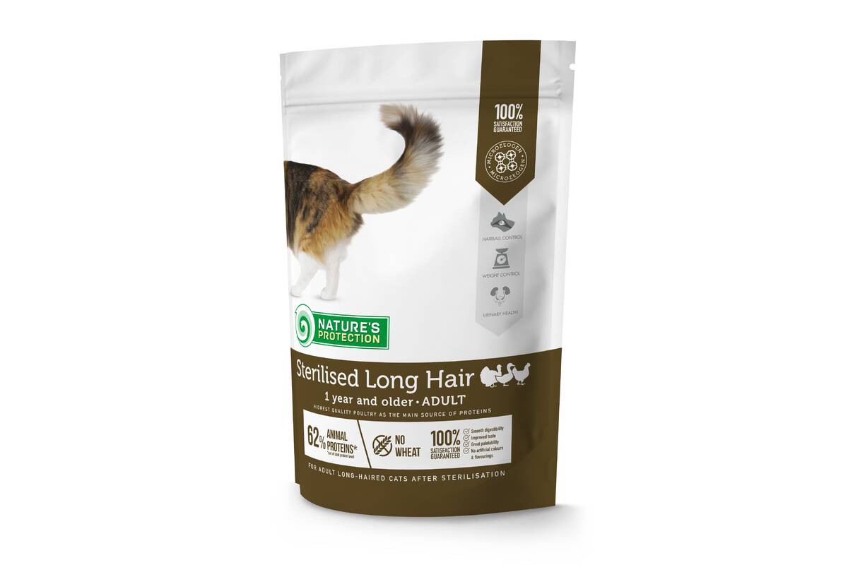 Nature's Protection Sterilised Long Hair for adult cats are created with ingredients that are perfect for providing the necessary amount of calories, vitamins and minerals for sterilised cats with long coat. The main protein source of this dry cat food is poultry. It is a high quality protein that is an excellent source of nutrition for cats, as it is packed with essential nutrients that can help promote good health. This dry food's complete and balanced composition is enriched with natural supplements like MicroZeoGen that help remove toxins from the body and support a healthy immune system. The composition is enriched with Omega-3 and Omega-6 fatty acids essential for healthy skin and coat conditions. As well as mono- and polyunsaturated fatty acids support the immune system, while saturated fatty acids provide required energy. This cat food is also fiber-rich diet designed to aid in hairball control, promoting healthy digestion and ensuring the overall well-being of cats. All ingredients are carefully selected by veterinary and nutritional experts based on the true needs of your pet.