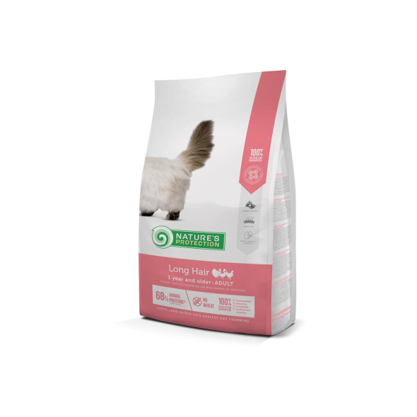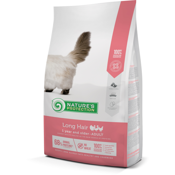 Nature's Protection Long Hair for adult cats are created with ingredients that are perfect for providing the necessary amount of calories, vitamins and minerals for cats with long coat. The main protein source of this dry cat food is poultry. It is a high quality protein that is an excellent source of nutrition for cats, as it is packed with essential nutrients that can help promote good health. This dry food's complete and balanced composition is enriched with natural supplements likeMicroZeoGen that help remove toxins from the body and support a healthy immune system. The composition is enriched with Omega-3 and Omega-6 fatty acids essential for healthy skin and coat conditions. As well as mono- and polyunsaturated fatty acids support the immune system, while saturated fatty acids provide required energy. This cat food is also fiber-rich diet designed to aid in hairball control, promoting healthy digestion and ensuring the overall well-being of cats. All ingredients are carefully selected by veterinary and nutritional experts based on the true needs of your pet.