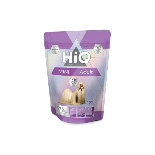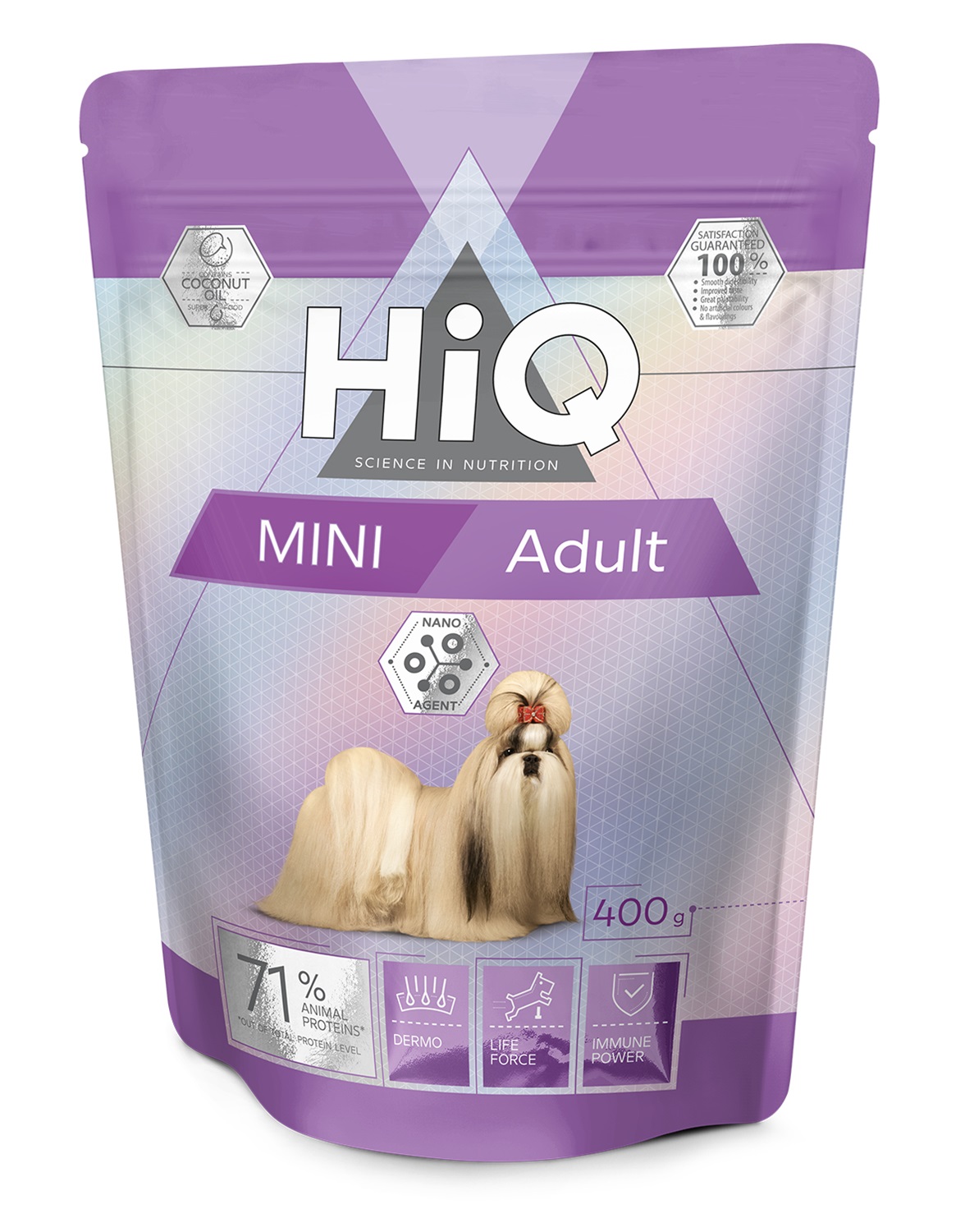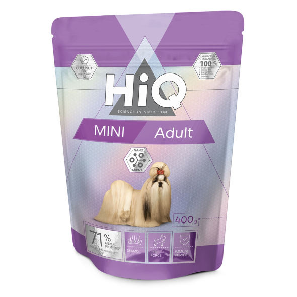 HiQ Mini Adult - Super Premium (premium) quality dry food for small breeds (1-10 kg) for adult dogs for smooth bowel activity and excellent digestion. The composition of this dry food is enriched with unique ingredients, which especially improve the well-being of small breeds of puppies. The ingredients will not only provide your pet's body with all the necessary materials, but will also ensure a good condition for theskin.