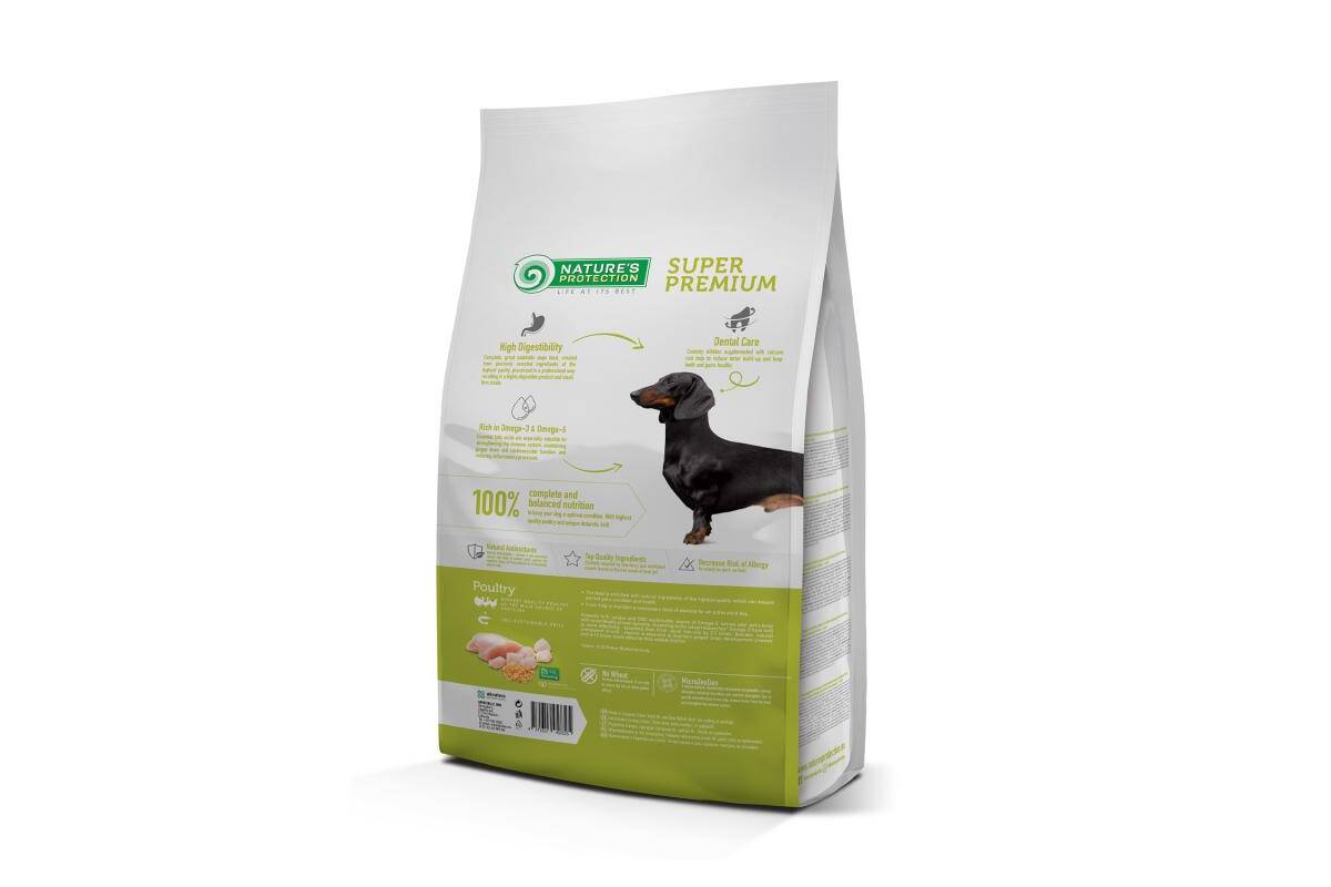 Nature's Protection for Adult Small Breed Dogs with Poultry is known for its well-balanced composition and raw materials, which help to improve the smooth digestive system, maintain healthy weight and resulting small, firm stools. The main protein source of this dry dog food is poultry. It is a high quality protein that is an excellent source of nutrition for dogs, as it is packed with essential nutrients that can help promote overall health. It also contains an Antarctic krill, a unique and 100% sustainable source of Omega-3 and choline, which improves skin and coat condition, reduces inflammation, and supports brain activity. This dry dog food's complete and balanced composition is enriched with natural supplements like MicroZeoGen that help remove toxins from the body and support a healthy immune system. The composition contains Omega-3 and Omega-6 fatty acids essential for healthy skin and coat conditions. As well as mono- and polyunsaturated fatty acids support the immune system, while saturated fatty acids provide energy to a dog. Also, the feed contains natural antioxidants - vitamin E and rosemary extract can help protect cells against the negative impact of free radicals in a completely natural way. All ingredients are carefully selected by veterinary and nutritional experts based on the true needs of your pet.