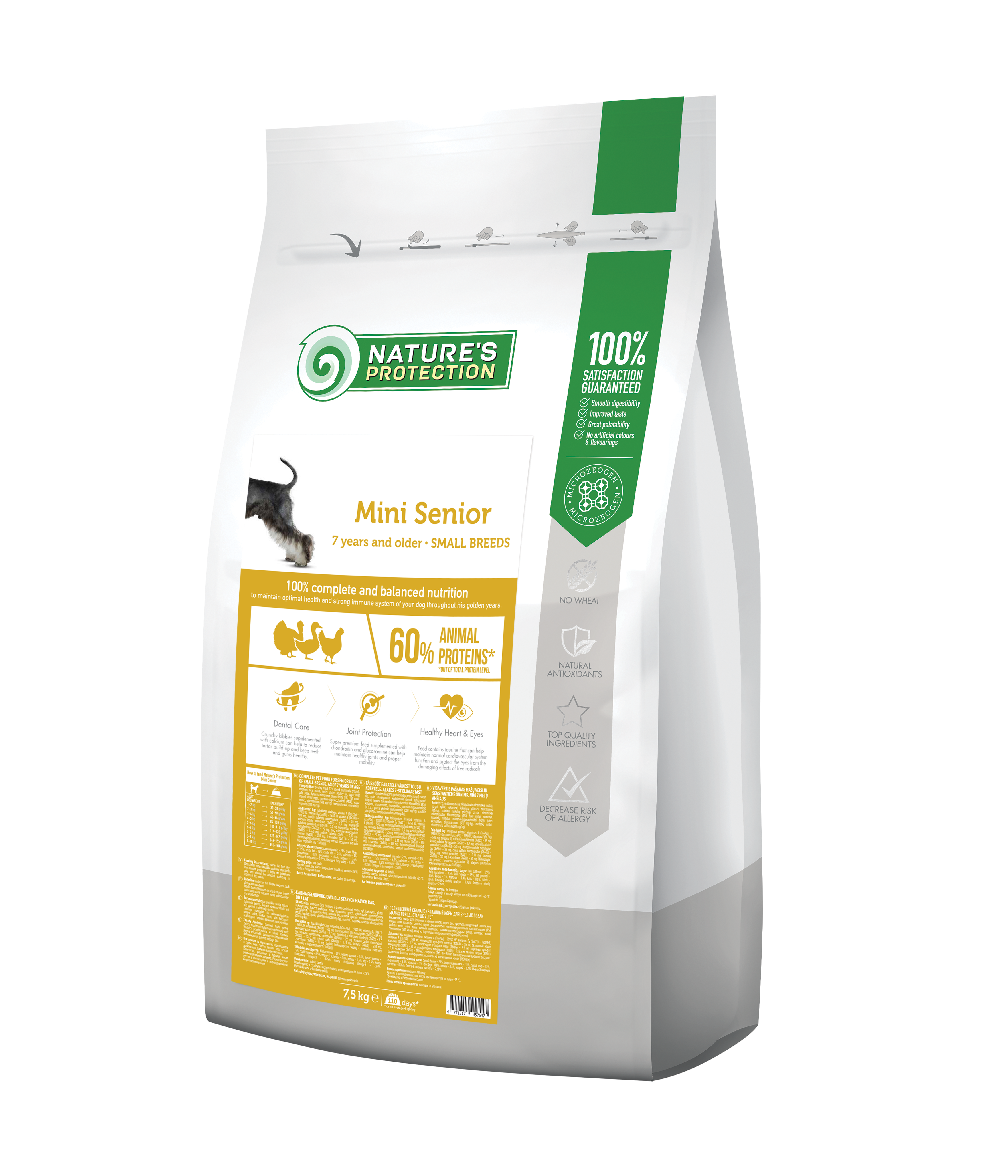 Nature's Protection Mini Senior for Small Breed Dogs are created with ingredients that are perfect for providing the necessary amount of calories, vitamins and minerals for the needs of a senior dog. The main protein source of this dry dog food is poultry. It is a high quality protein that is an excellent source of nutrition, as it is packed with essential nutrients that provide and support the immunity necessary for strong and healthy older dogs. This dry dog food's complete and balanced composition is enriched with natural supplements like MicroZeoGen that help remove toxins from the body and support a healthy immune system. The composition contains Omega-3 and Omega-6 fatty acids essential for healthy skin and coat, maintaining proper brain and cardiovascular functions. As well as mono- and polyunsaturated fatty acidssupport the immune system, while saturated fatty acids provide energy to a dog. Also, the feed contains marigold blossoms, which are known for their anti-inflammatory properties and natural antioxidants - vitamin E and rosemary extract can help protect cells against the negative impact of free radicals in a completely natural way. All ingredients are carefully selected by veterinary and nutritional experts based on the true needs of your pet.