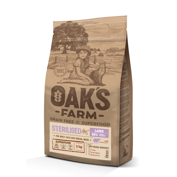 OAK'S FARM dry grain free food for adult cats after sterilisation with lamb 2 kg