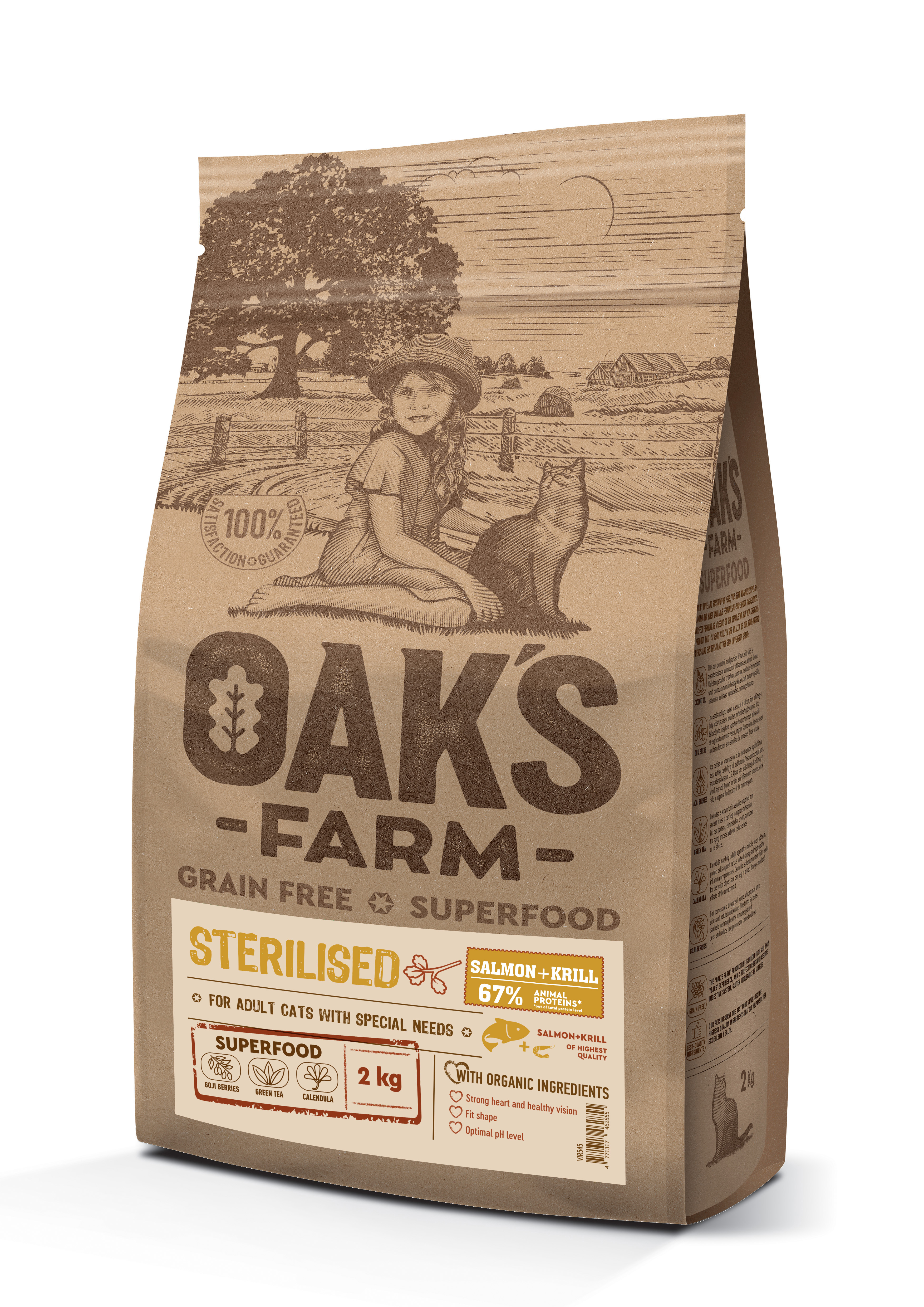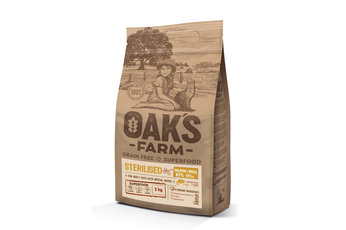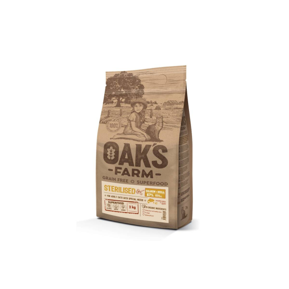 OAK'S FARM dry grain free food for adult cats after sterilisation with salmon and krill 2 kg