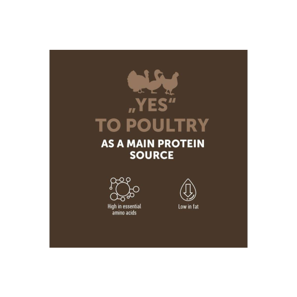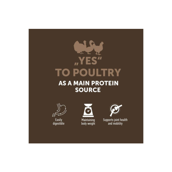 Composition: poultry meat 40% (dried and finely ground), potato flakes, potato pellets, poultry fat, peas, sugar beet pulp, brewer’s yeast, chicken liver hydrolysate, linseed, dried carrots, cellulose, coconut oil (1%), dynamic micronized clinoptilolite (1%), egg powder, fructooligosaccharides (FOS), cranberry dried, marigold dried.