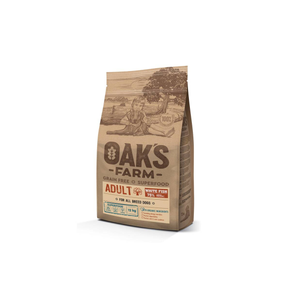 OAK'S FARM Grain Free White Fish Adult All Breeds grainless food with white fish for adult dogs of all breeds is a fully balanced, hypoallergenic, premium class food with superfused and organic ingredients. The composition of dry food is enriched with unique ingredients that strengthen the body of pets. The proteins of animal origin in the composition provide the pet's body with a balanced amount of amino acids for a healthy and energetic life.