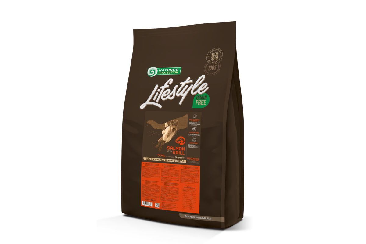 Nature's Protection Lifestyle Grain Free with Salmon and Krill for Small and Mini Breed Dogs is known for its well-balanced composition and raw materials, which help to improve the smooth digestive system. The main source of protein in this complete dry dog food is salmon. It also contains krill. Salmon is a hypoallergenic source of high-quality protein and nutrients. Both salmon and krill are easily digestible and rich in omega-3 fatty acids, which promote healthy skin, coat and maintain smooth brain and eye functioning. The complete and balanced composition of this dry dog food is enriched with clinoptilolite of volcanic origin from nature – MicroZeoGen. It helps to remove toxins from the pet's body and when it is detoxified the efficient nutrients, vitamins, and minerals easily absorb into the body. The composition does not contain ingredients of grain origin, so it can help to reduce the risk of allergies for dogs with sensitive digestive systems since it does not burden the digestive tract.