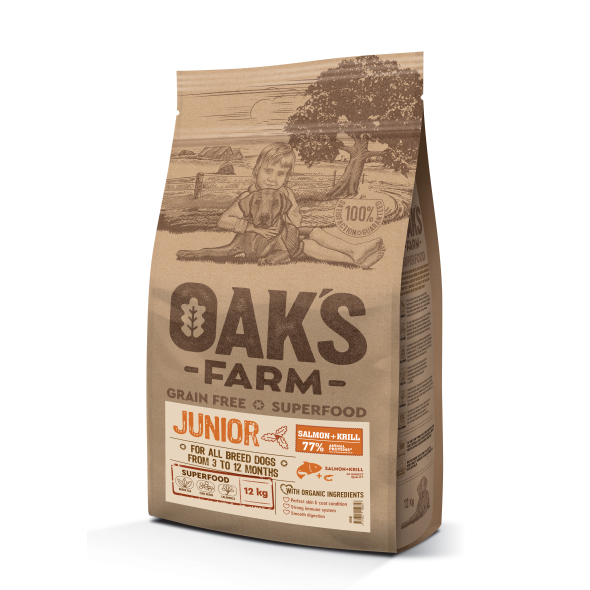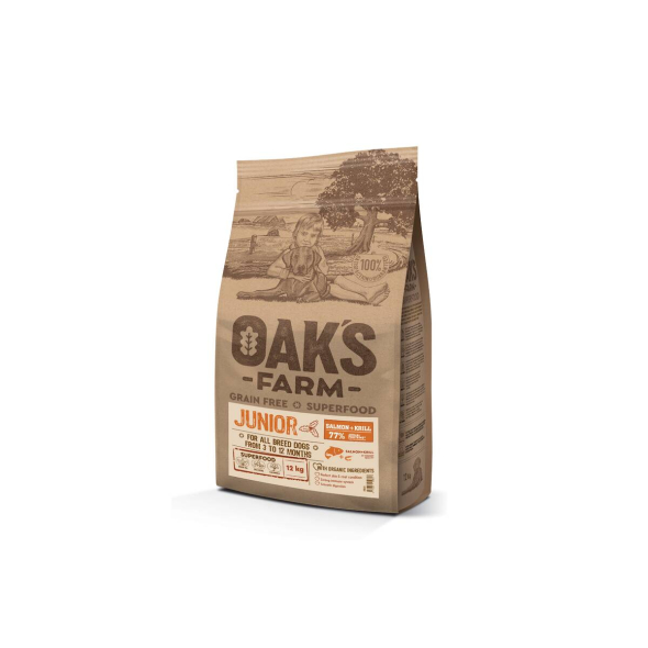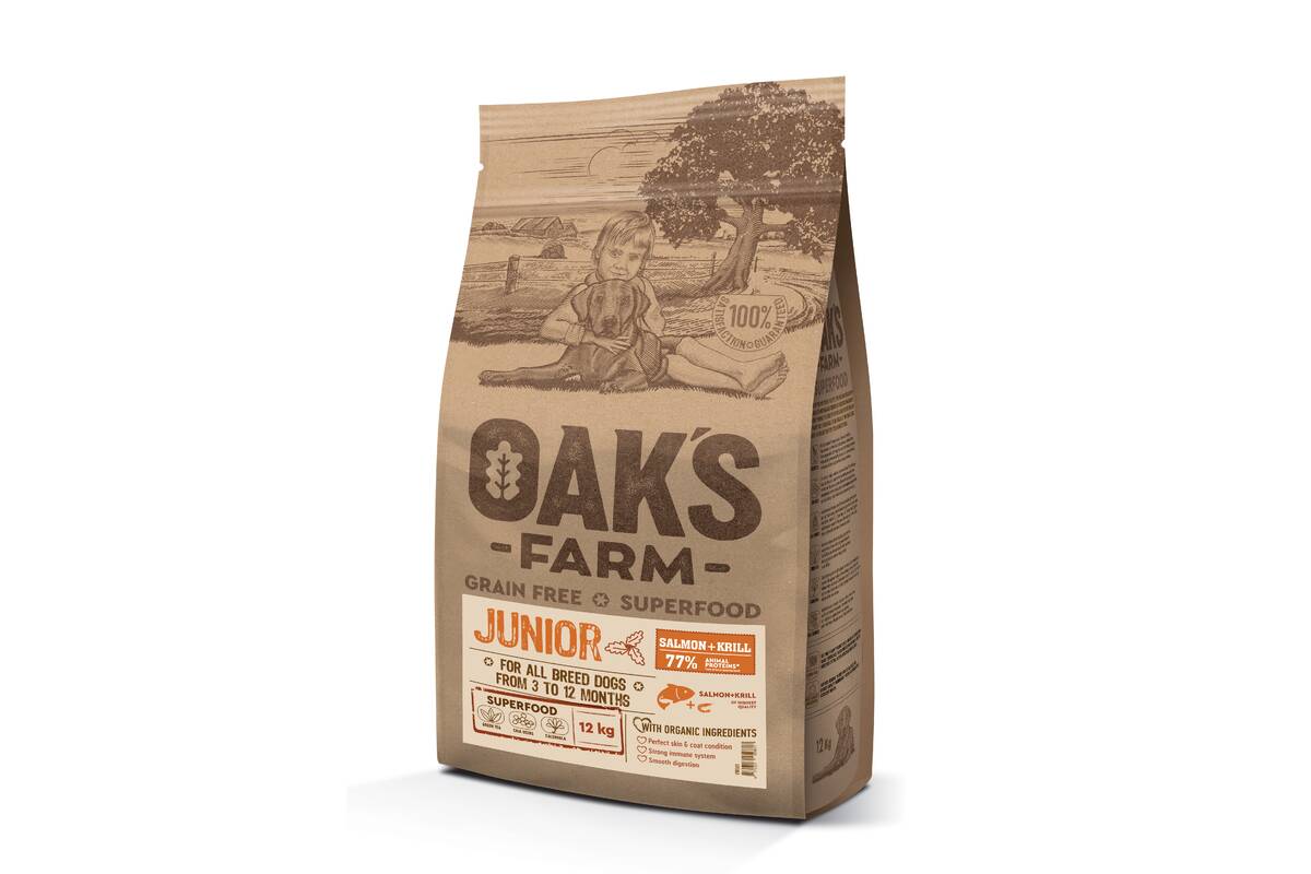 OAK'S FARM dry grain free food for junior dogs of all breeds with salmon and krill 12 kg