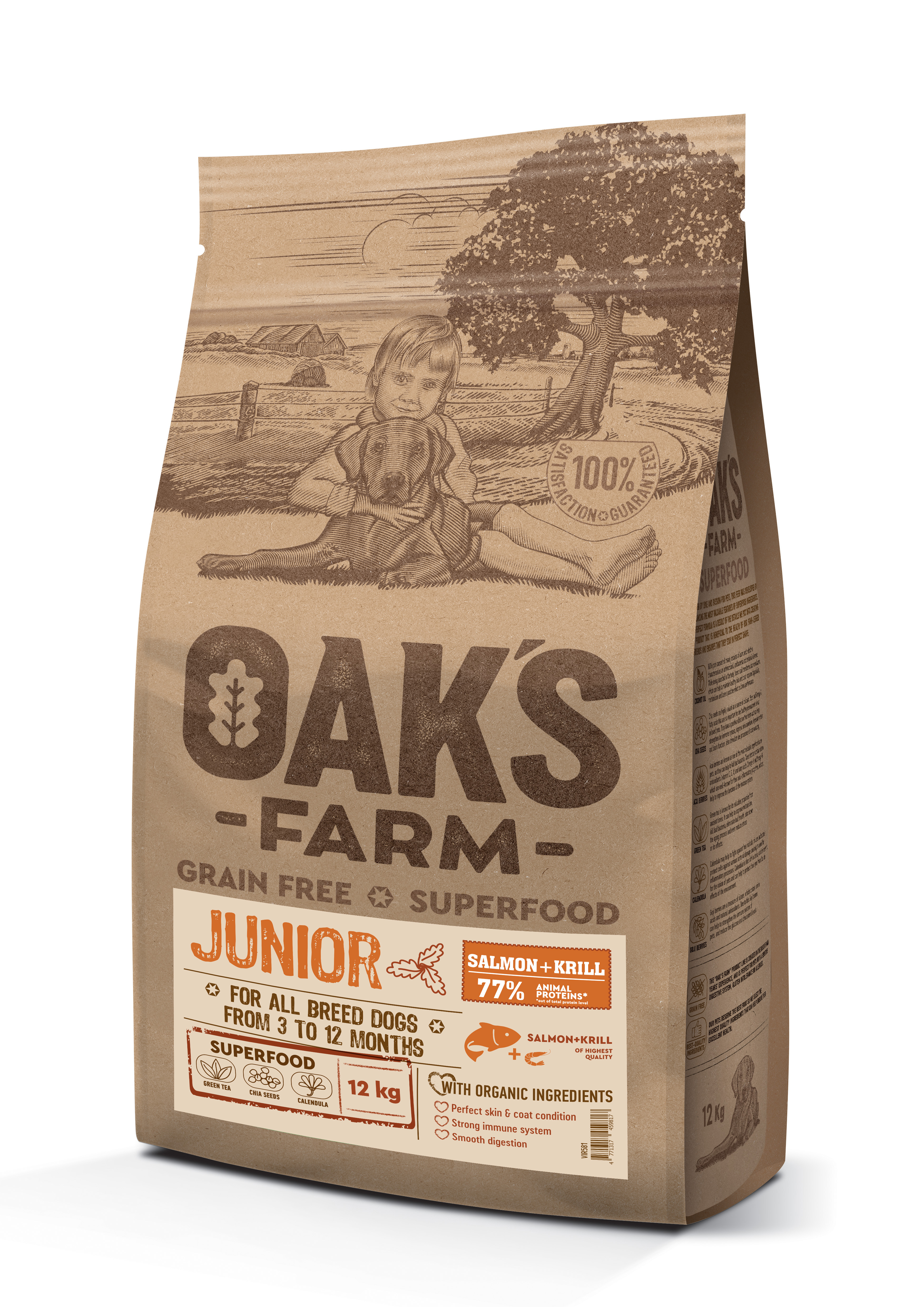OAK'S FARM Grain Free Salmon with Krill Junior All Breeds grainless food with salmon and krill for young puppies of all breeds is a fully balanced, hypoallergenic, Premium class feed with superfood and organic ingredients. The composition of dry food is enriched with unique ingredients that are intended for a growing and energy-intensive organism. The proteins of animal origin in the composition provide the pet's body with a balanced amount of amino acids for a healthy and energetic life.