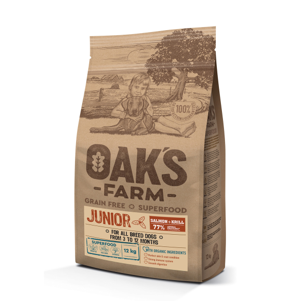 OAK'S FARM Grain Free Salmon with Krill Junior All Breeds grainless food with salmon and krill for young puppies of all breeds is a fully balanced, hypoallergenic, premium class feed and organic ingredients. The composition of dry food is enriched with unique ingredients that are intended for a growing and energy-intensive organism. The proteins of animal origin in the composition provide the pet's body with a balanced amount of amino acids for a healthy and energetic life.