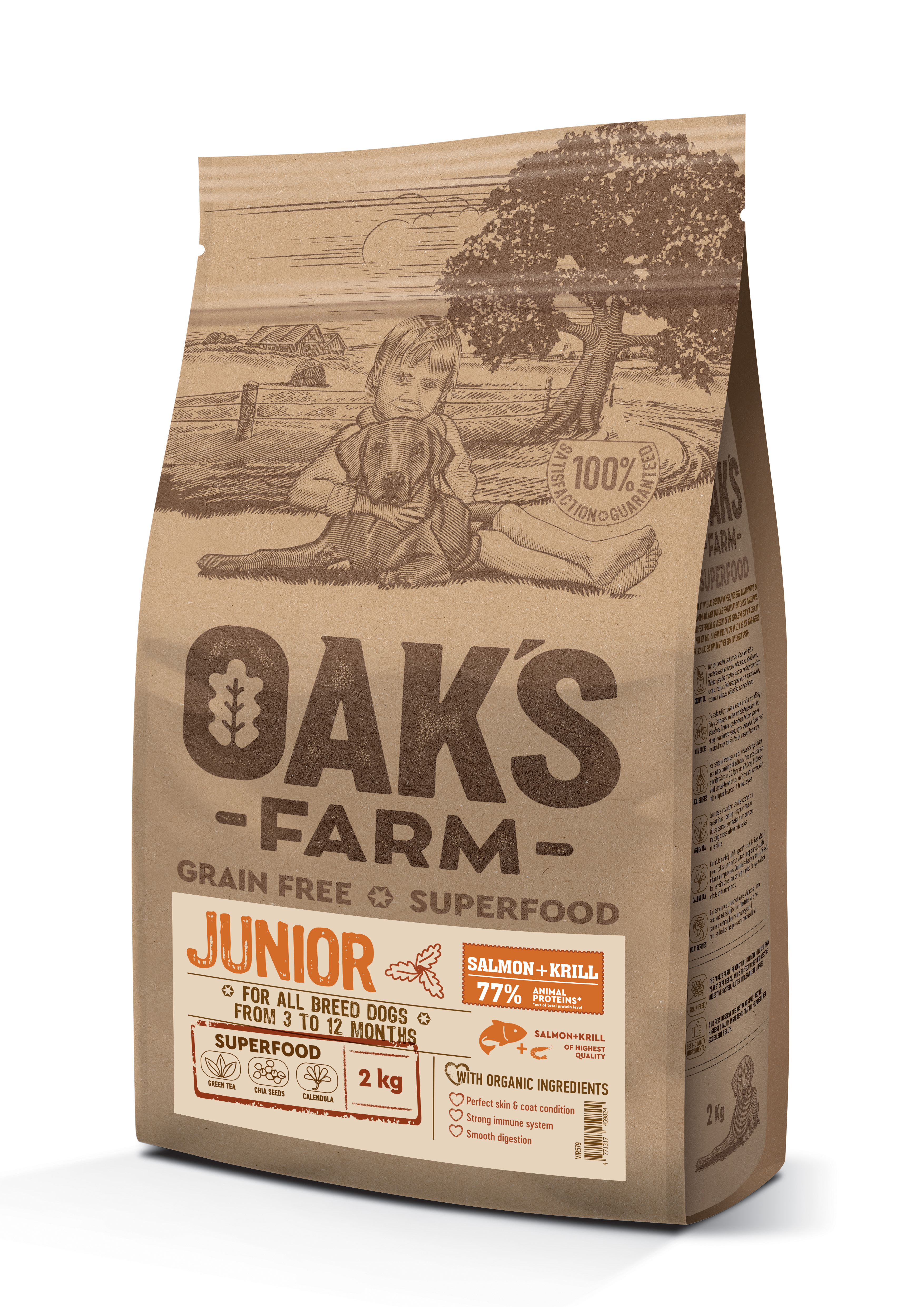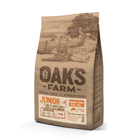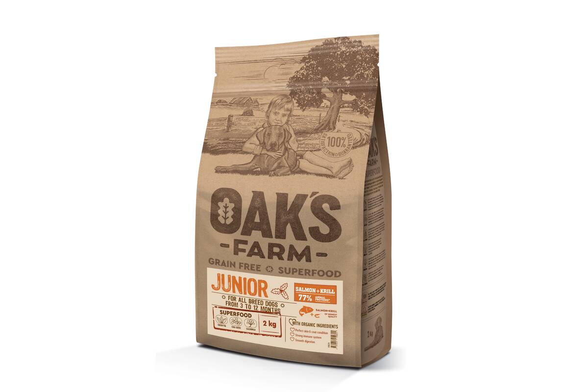 OAK'S FARM dry grain free food for junior dogs of all breeds with salmon and krill 2 kg