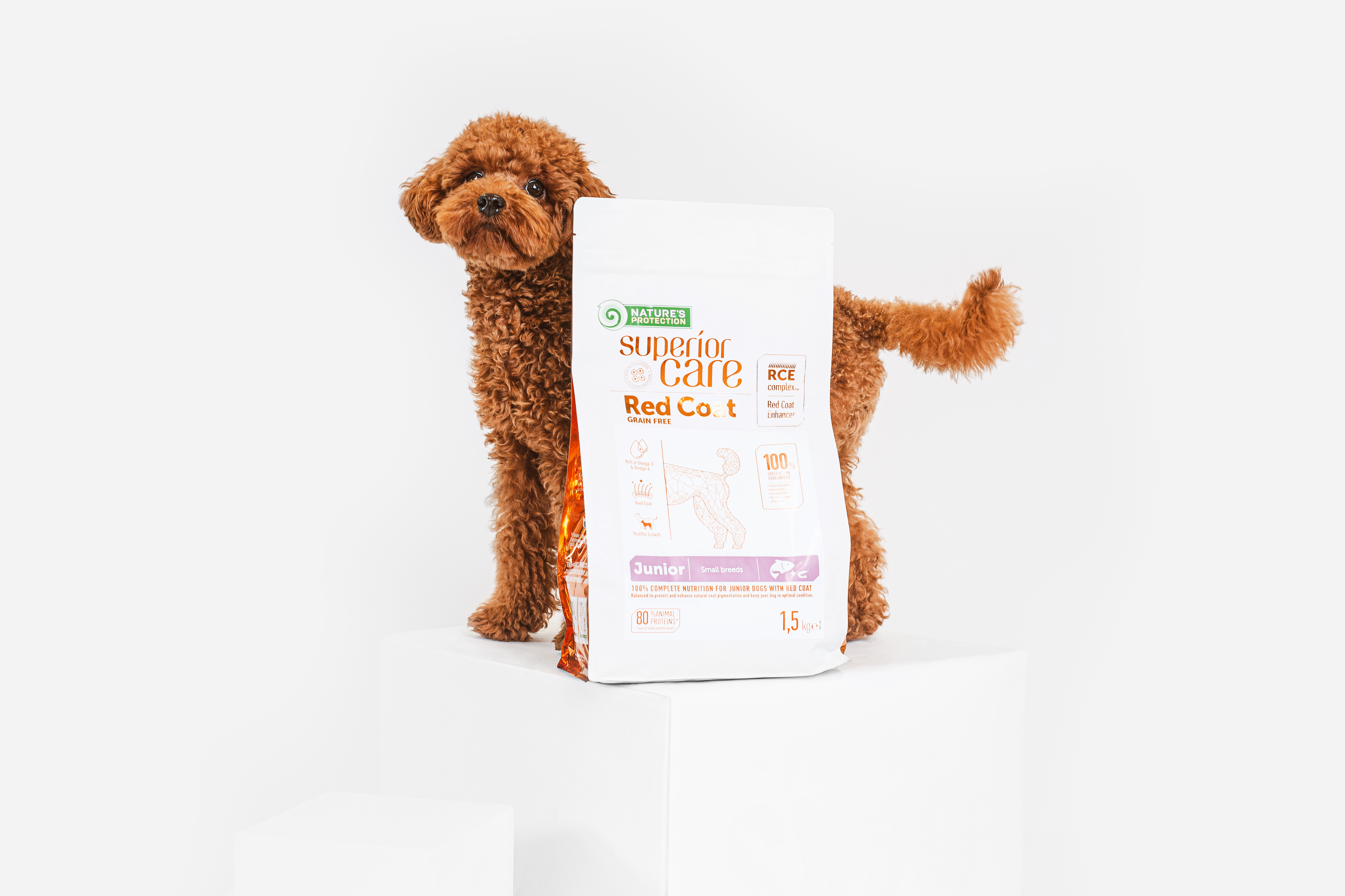 Nature's Protection Red Coat Grain Free with Salmon for Junior Small Breed dogs is well known for its RCE Complex (Red Coat Enhancer Balanced Amino Acid Complex), a balanced composition that helps protect and enhance the natural pigmentation of the brown and red coats and maintain the clear tiers and saliva composition. The main source of protein in this dry dog food is Salmon. It is a high quality protein that is an excellent source of nutrition for dogs, as it is packed with essential nutrients that can help promote good health. It also contains an Antarctic krill, a unique and 100% sustainable source of Omega-3 and choline, which improves skin and coat condition, supports brain activity. The complete and balanced composition of this dry dog food is enriched with clinoptilolite of volcanic origin from nature - MicroZeoGen. It helps to remove toxins from the pet's body and when it is detoxified the efficient nutrients, vitamins, and minerals easily absorb into the body. The composition is enriched with Omega-3 and Omega-6 fatty acids essential for healthy skin and coat conditions. As well Microalgae are an excellent source of iron, which promotes the good development of the brain and a strong immune system. Carefully selected ingredients provide your pet’s brain with the ingredients it needs from the first months of a puppy’s growth.