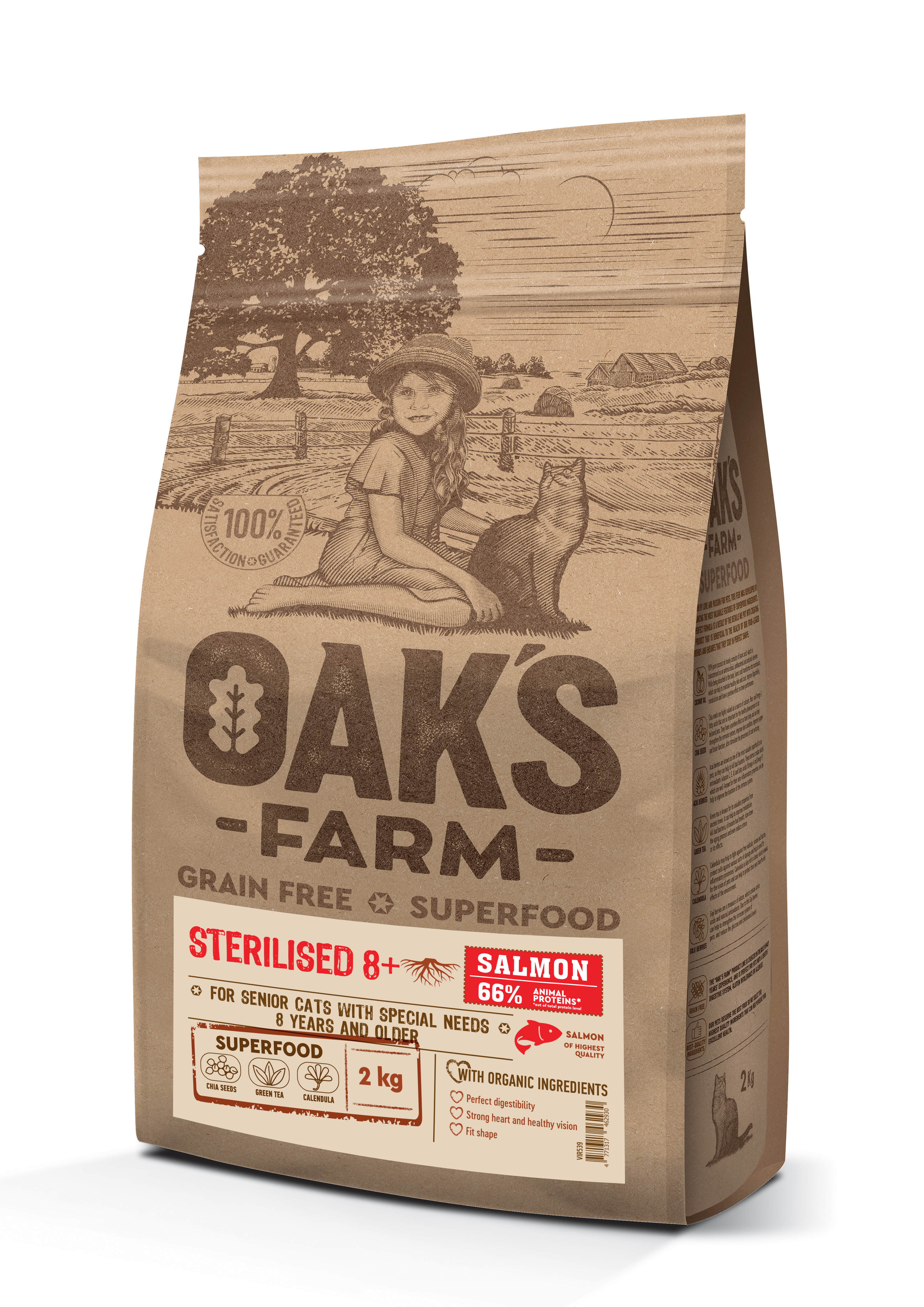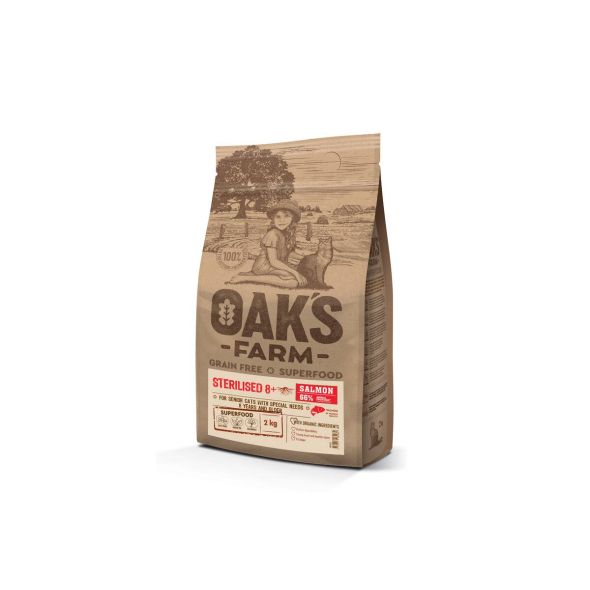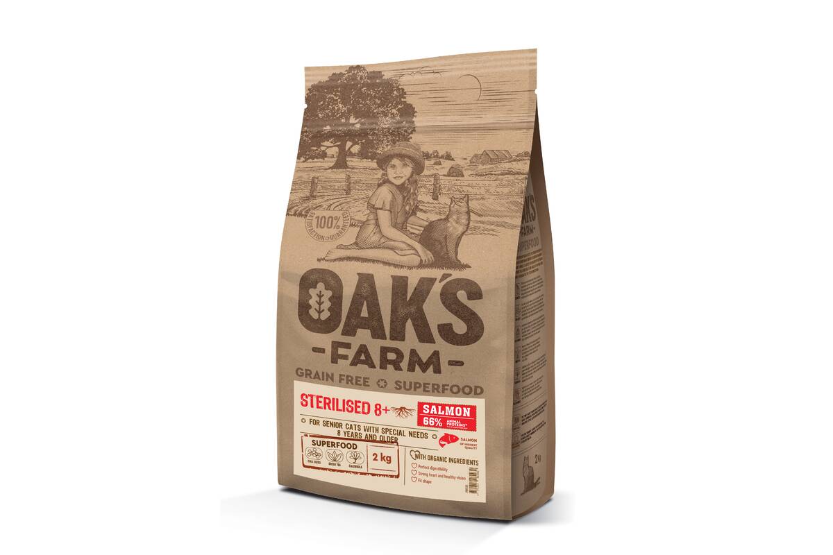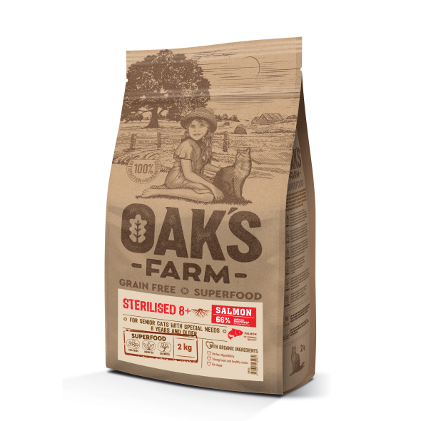 OAK'S FARM Grain-Free Salmon Sterilised 8+ Cat grainless food with salmon and krill for sterilized older cats is a fully balanced, hypoallergenic, Superpremium class food with superfood and organic ingredients. This food is intended for weight control, obesity-prone, older cats.