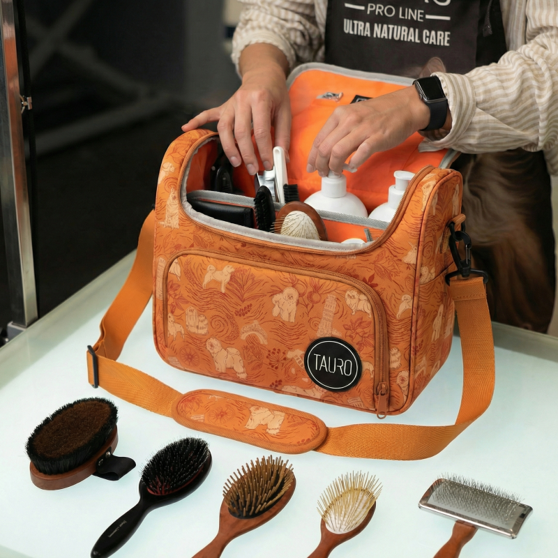 TAURO groomer’s work bag is a professional accessory designed for structured and convenient organisation of grooming tools and supplies. The bag is suitable for daily use both in grooming salons and in mobile working environments, such as shows, training sessions or on-site services.
