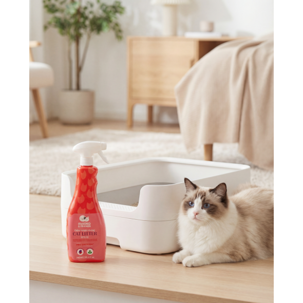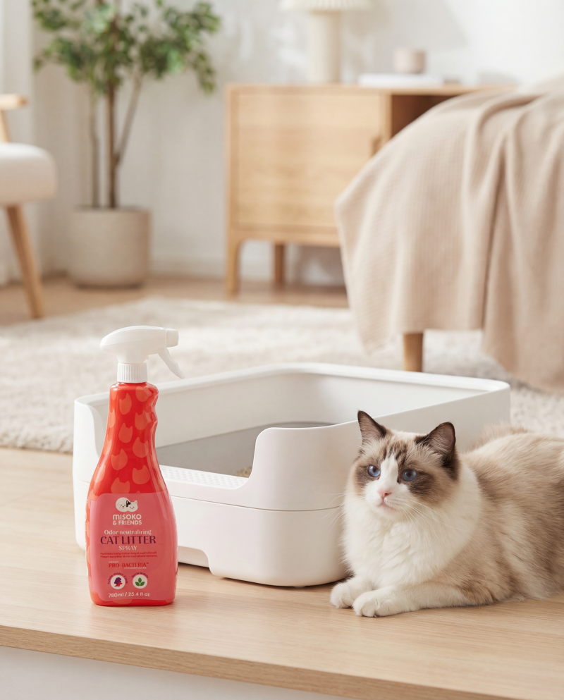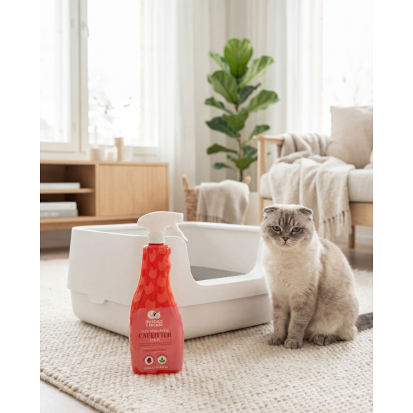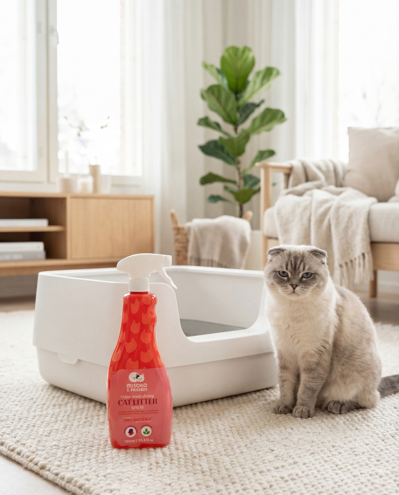 MISOKO & FRIENDS Odor and Stain Remover for Cat Litter – 750 ml – your daily helper for keeping the litter box fresh and clean. Unlike most universal cleaners, this spray is specially formulated for cats: its pH is gentle, and it contains no strong fragrances or harsh chemicals, making it safe and comfortable even for sensitive feline noses.