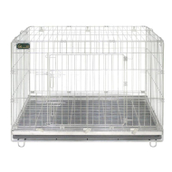 It features a secure locking door for safe closure. The removable grid tray at the bottom separates the pet from waste or liquids and can be easily removed for cleaning. Thanks to modular panel design, you can use it as a crate or connect panels to form a fence / enclosure.