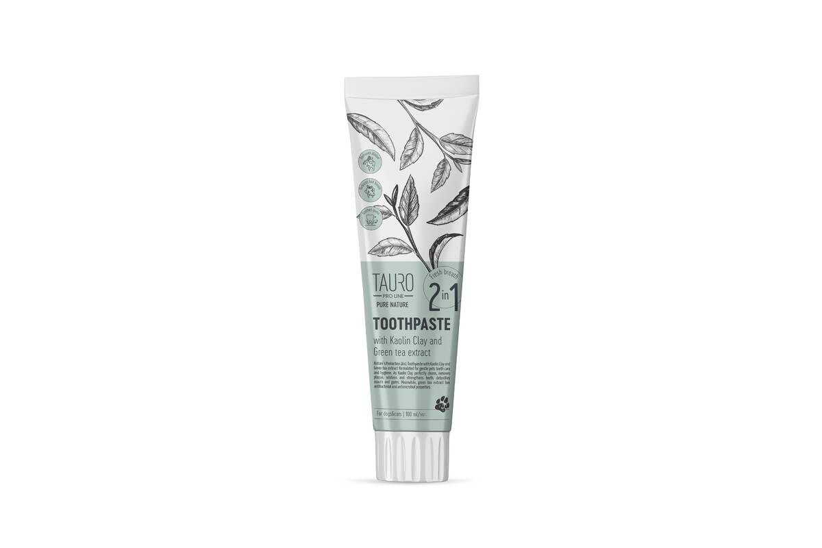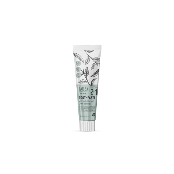 Tauro Pro Line Pure Nature 2in1 Toothpaste with Kaolin Clay and Green tea extract formulated for gentle pets teeth care and hygiene. As Kaolin Clay perfectly cleans, removes plaque, whitens and strengthens teeth, detoxifies mouth and gums. Meanwhile, green tea extract has antibacterial and antimicrobial properties.