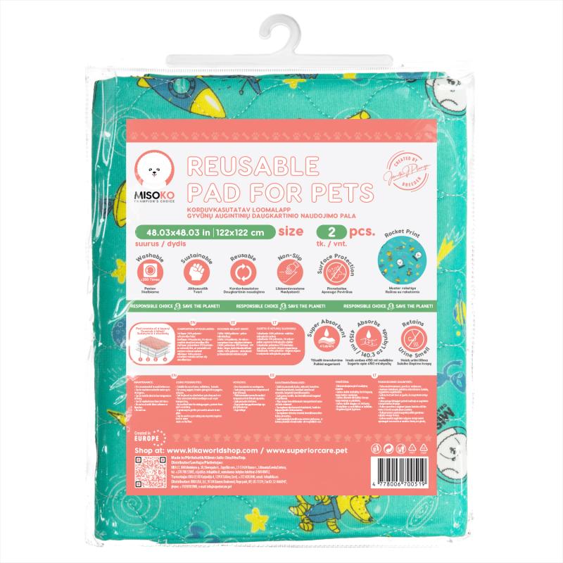 MISOKO reusable pad for pets, 2 psc. with rockets, mint colour, 122x122 cm