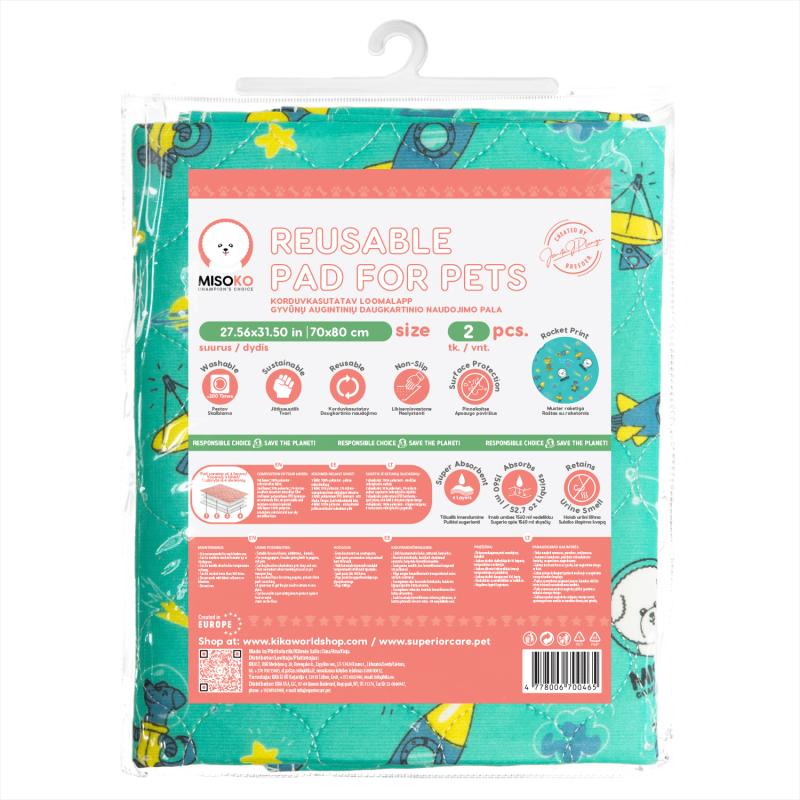 MISOKO reusable pad for pets, 2 psc. with rockets, mint colour, 70x80 cm