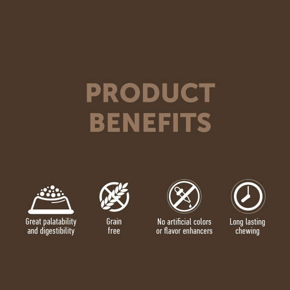 These treats are made without artificial colors, antioxidants, or flavor enhancers – only from natural components beneficial to your dog’s body. The product is also grain-free, making it ideal for pets with sensitive digestion or food intolerances. The easily digestible composition is gentle on the digestive tract and supports overall well-being on a daily basis.