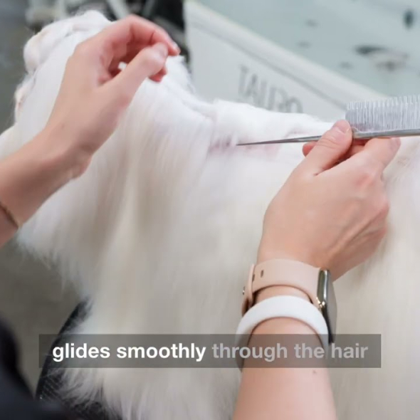 Tauro Pro Line combs are expertly designed by professionals to ensure top-notch quality. The lightweight 19.3 cm comb ensures comfortable use when combing your pet. It has a perfect ability to open the coat which helps to reach a volume effect. The iron chrome-coated teeth are specifically crafted to lift the coat from the roots, facilitating even easier combing. This comb is specially designed to gently yet effectively comb the muzzles and paws of your four-legged companion. The Tauro Pro Line iron comb is particularly beneficial for styling and trimming the coat. The moisture-resistant iron combs make the combing process easier in all conditions and ensure long-lasting use. Introducing the Tauro Pro Line combs, meticulously crafted by professionals using the finest materials to deliver optimal results and transform pet combing into an effortless and enjoyable activity.