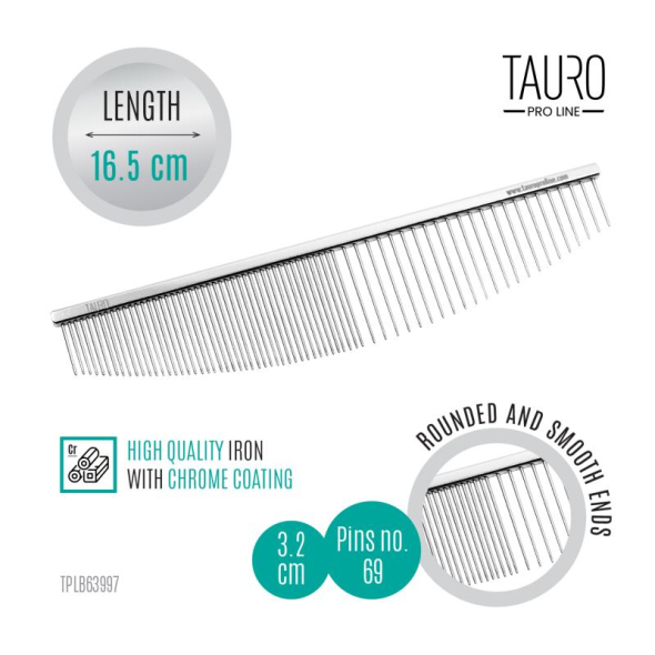 Tauro Pro Line combs are expertly designed by professionals to ensure top-notch quality. The lightweight 16.5 cm comb ensures comfortable use when combing your pet. It has a perfect ability to lift the coat from the roots and contains both wider and narrower parts to use as needed. This comb is specially designed to gently yet effectively comb the muzzles and paws of your four-legged companion. The Tauro Pro Line iron comb is particularly beneficial for styling and trimming the coat. The moisture-resistant iron combs make the combing process easier in all conditions and ensure long-lasting use. Introducing the Tauro Pro Line combs, meticulously crafted by professionals using the finest materials to deliver optimal results and transform pet combing into an effortless and enjoyable activity.