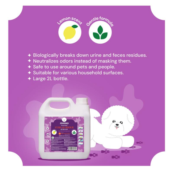 MISOKO Dog Stain & Odor Remover – Lemon Scent, 2000 ml, is designed for intensive use in multi-pet households, kennels, grooming salons, or pet hotels.